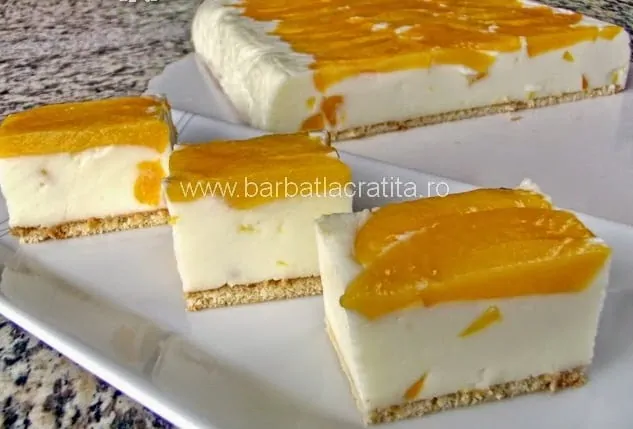 Na broskyne navrstvíme krém a naň uložíme maslové sušienky. Vložíme do chladničky stuhnúť.