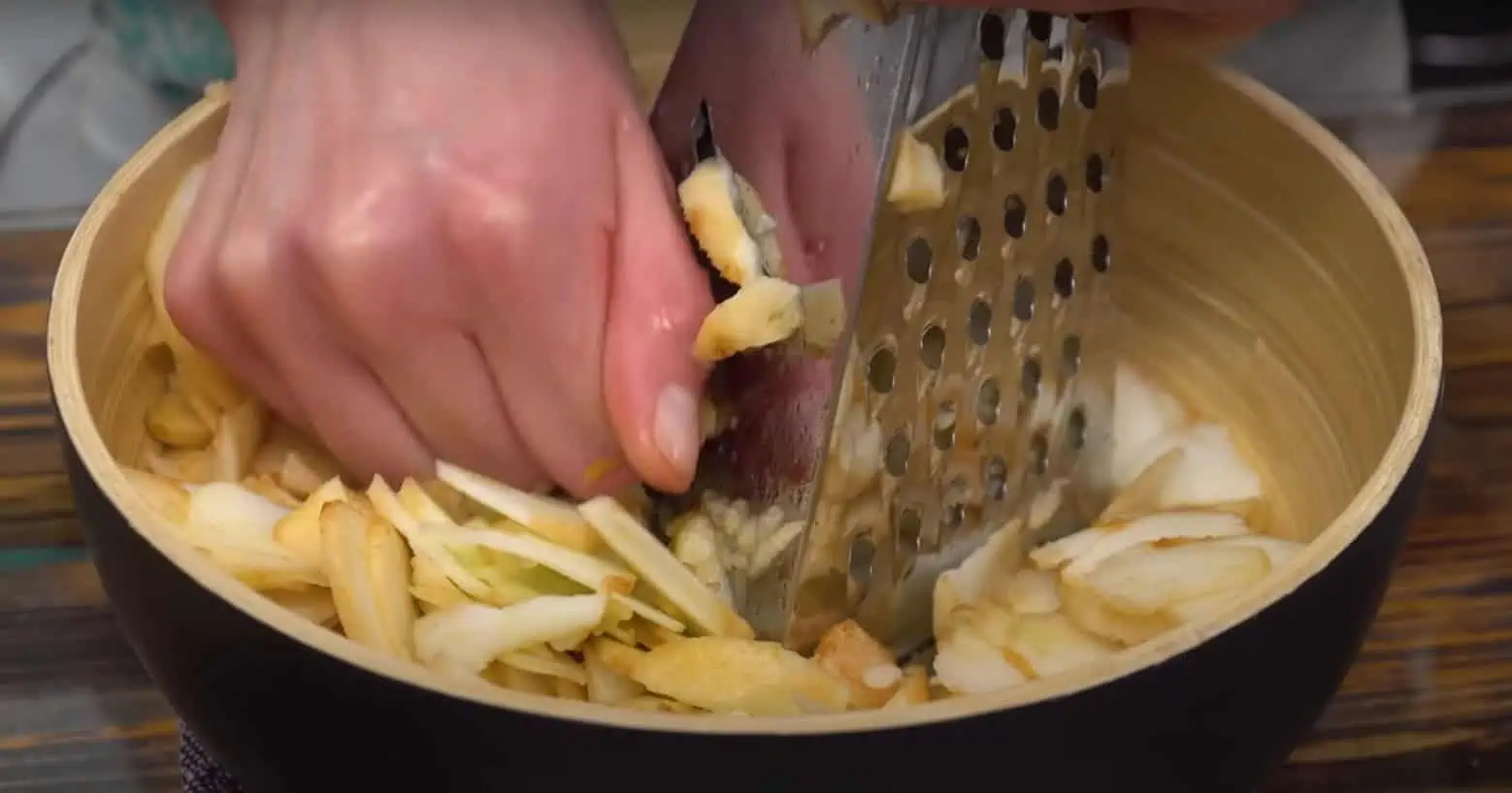 Cesto si rozdelíme na 2 časti, vložíme do misy a dáme do chladničky. Medzitým si pripravíme plnku. Jablká si ošúpeme, očistíme od jadrovníkov a nastrúhame na plátky.