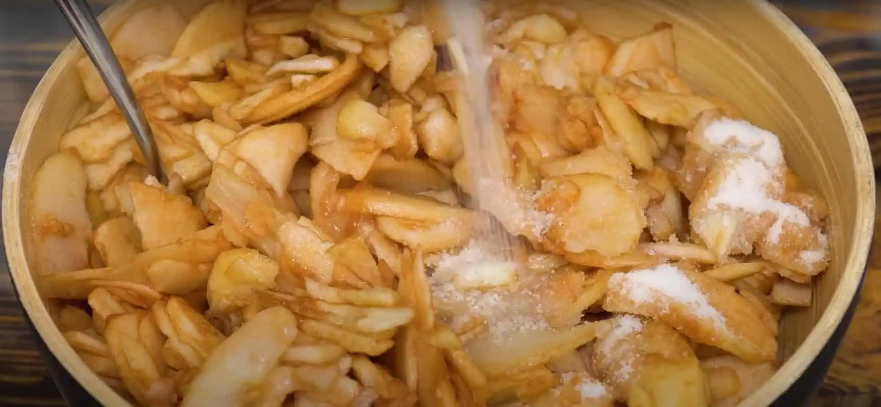 K jablkám pridáme cukor, citrónovú šťavu a premiešame. Môžeme pridať škoricu, alebo vanilkový cukor.