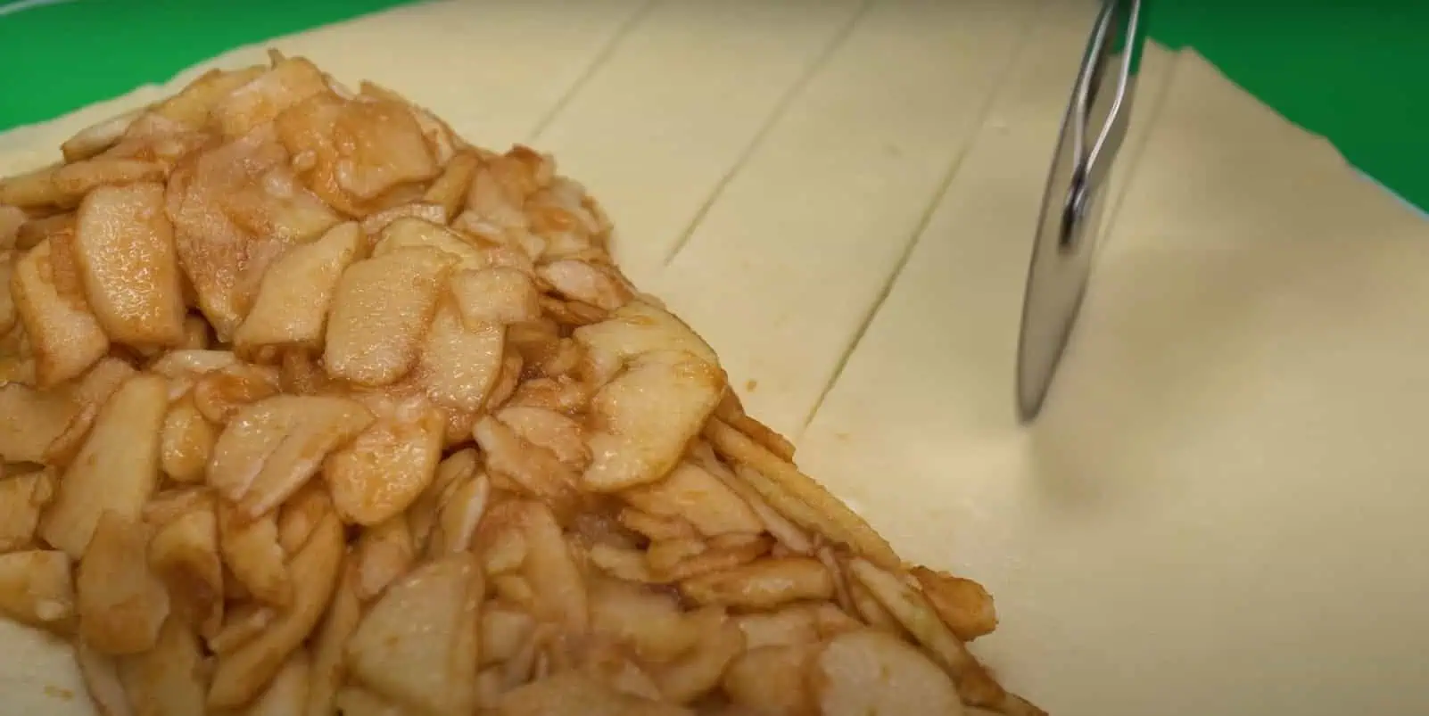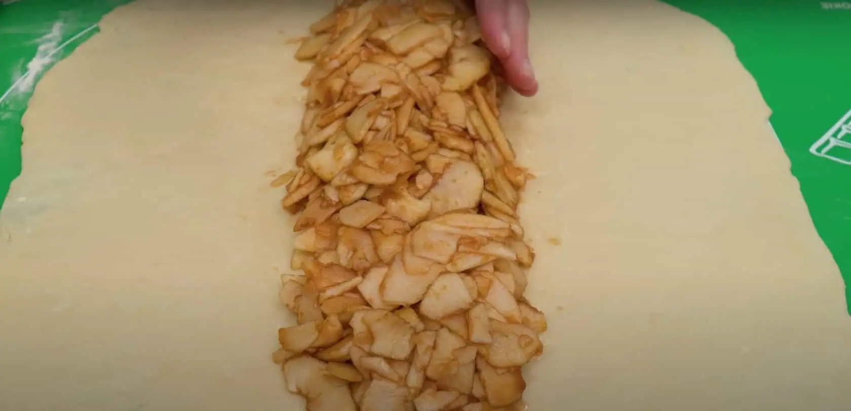 Na pomúčenú dosku si preložíme cesto a rozvaľkáme ho. Do stredu navrstvíme jablkovú plnku.