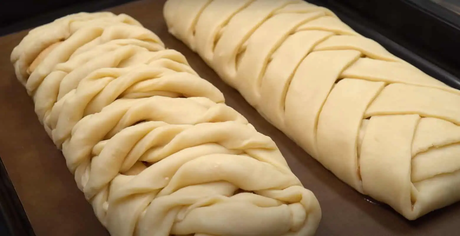 Závin preložíme na plech pokrytý papierom na pečenie. Rovnakým spôsobom naplníme a zavinieme aj druhý kus cesta. Prípadne môžeme jednotlivé pásy jemne stočiť a vytvoriť tak trochu iný vzor.