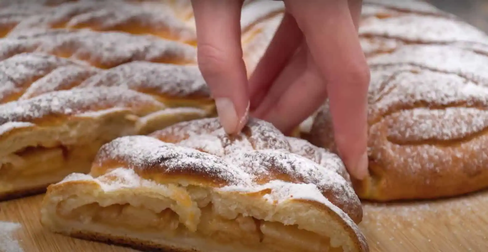Ideálna pochúťka na raňajky k čaju. Tento závin podľa jednoduchého receptu z youtube má bohatú jablkovú plnku a spolu s krehkým tvarohovým cestom sa každé sústo rozpúšťa na jazyku.