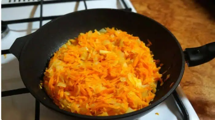 Na panvicu, na ktorej sa smažila cibuľa a mrkva, nalejeme štyri pohári vody.