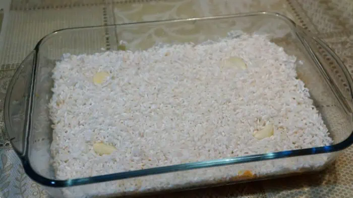 Do sklenenej formy rozložíme orestovanú zeleninu a na ňu surovú ryžu.