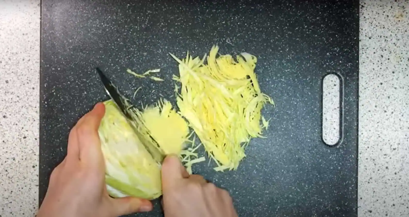 Cibuľu aj cesnak si ošúpeme, nakrájame a spolu rozmixujeme mixérom. Kapustu si umyjeme a nakrájame na tenučké slížiky.
