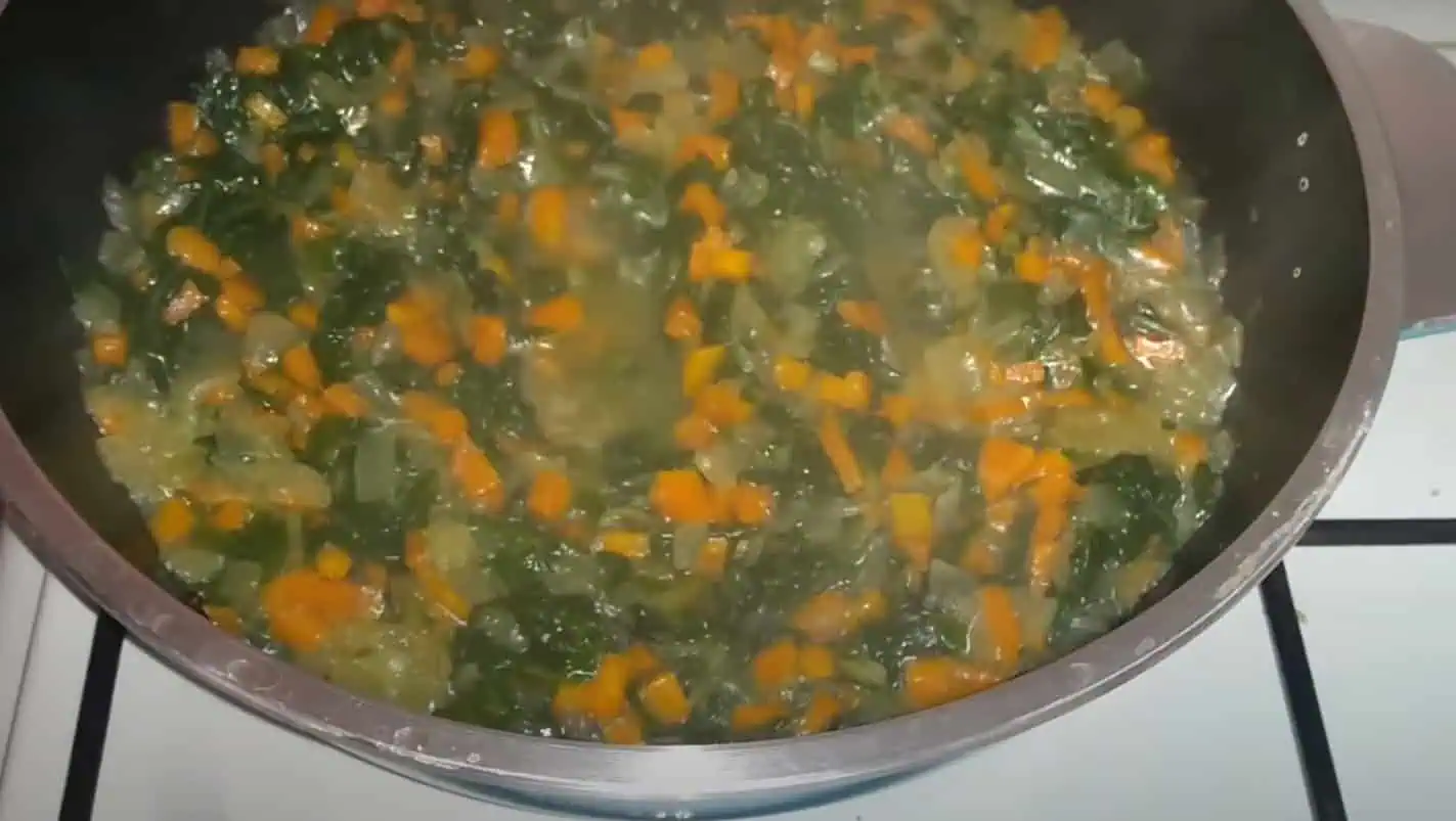 Mrkvu si očistíme, nakrájame na malé kocky a pridáme na panvicu spolu so špenátom. Osolíme a zalejeme 150 ml vody.