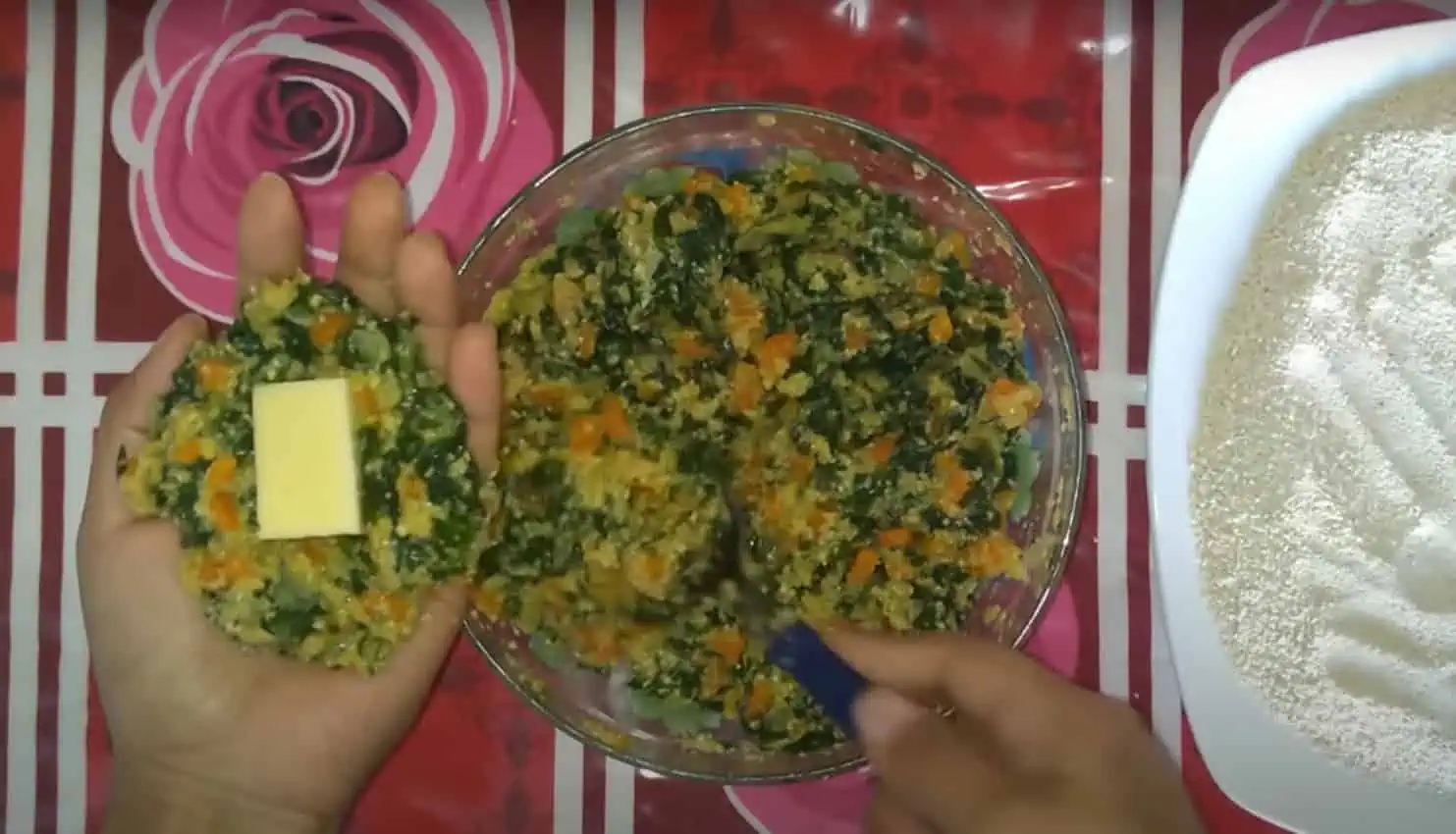K zelenine pridáme 3 vajcia, jemne osolíme a dobre premiešame. Nakoniec zmiešame so strúhankou.