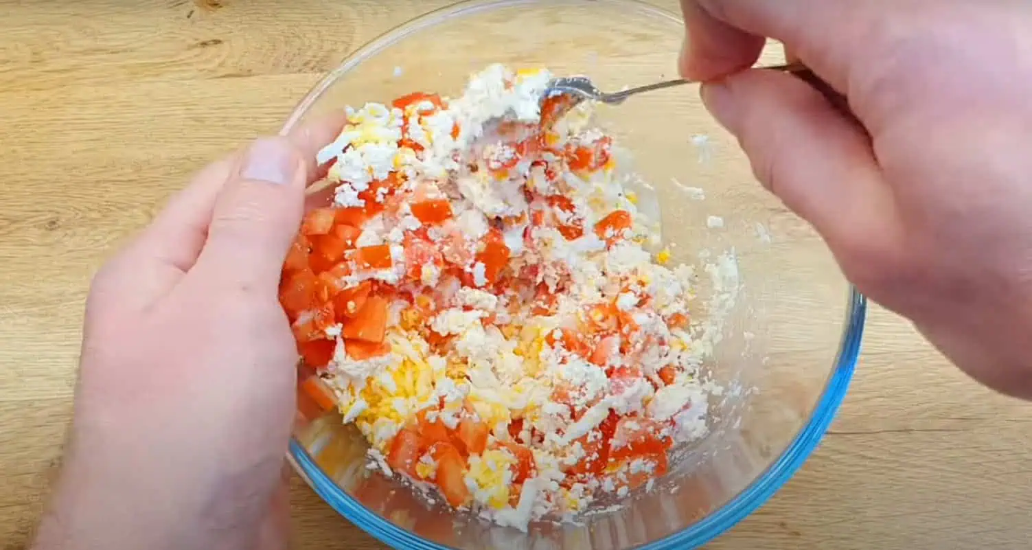 Syr, vajcia, aj nakrájanú paradajku premiešame s majonézou