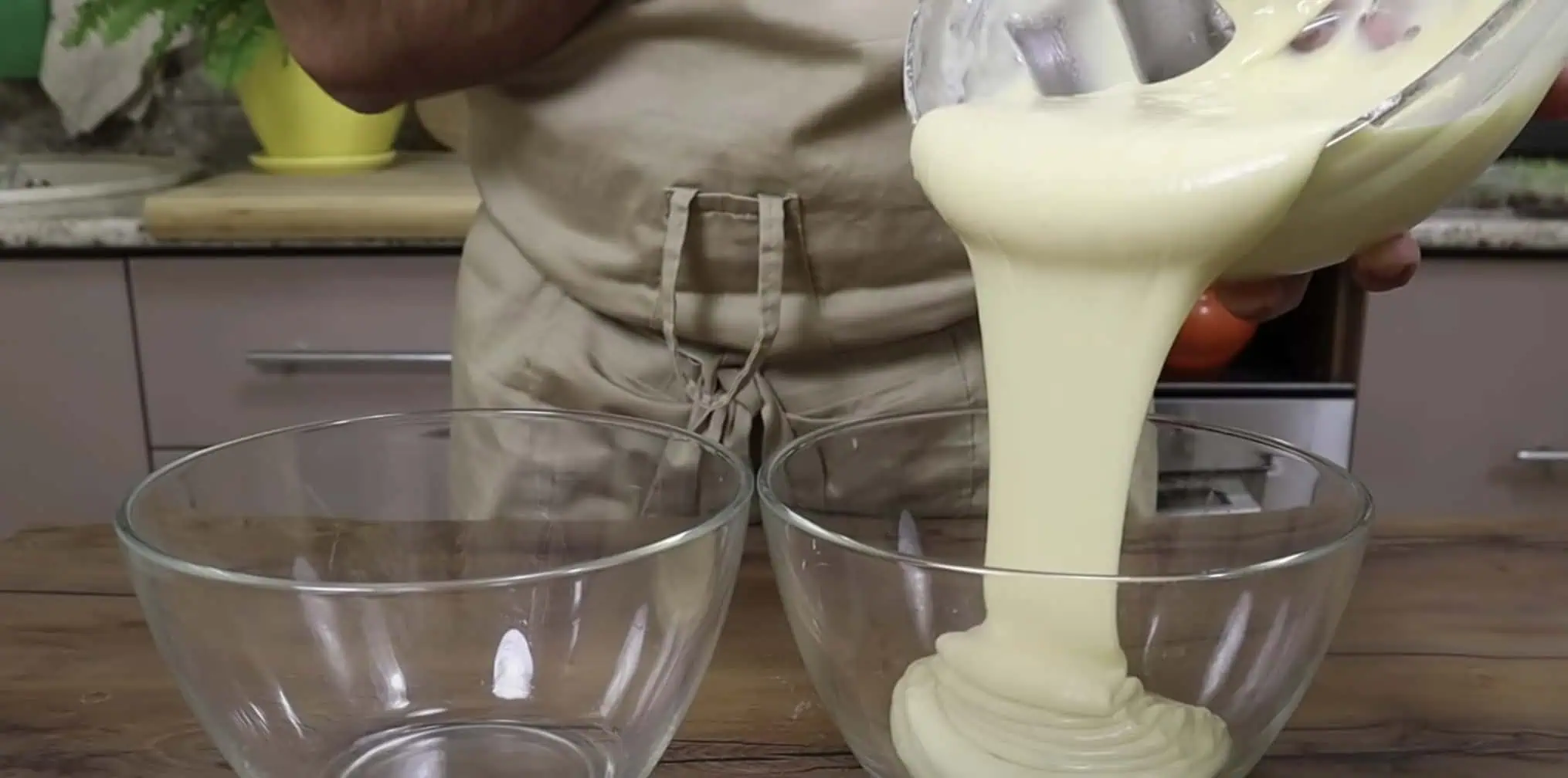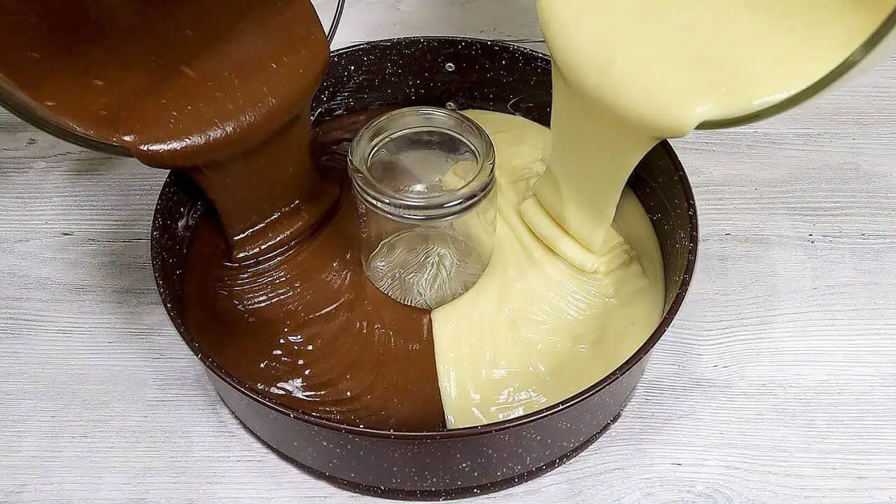 Do stredu formy dáme pohár a okolo nalejeme obe časti cesta – jednu na jednu polovicu, druhú na druhú polovicu.