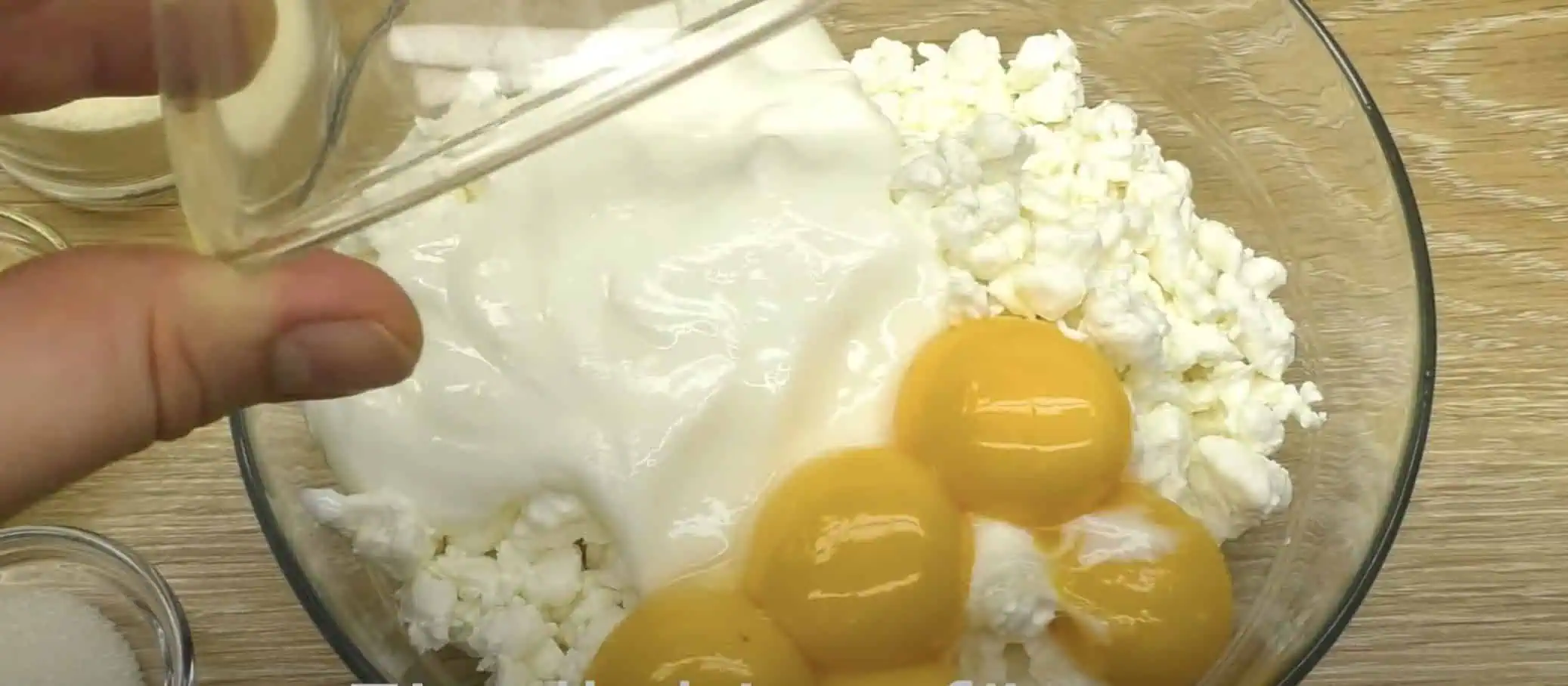 Do misky dáme tvaroh, žĺtky, citrónovú kôru, cukor, krupicu a vanilku.