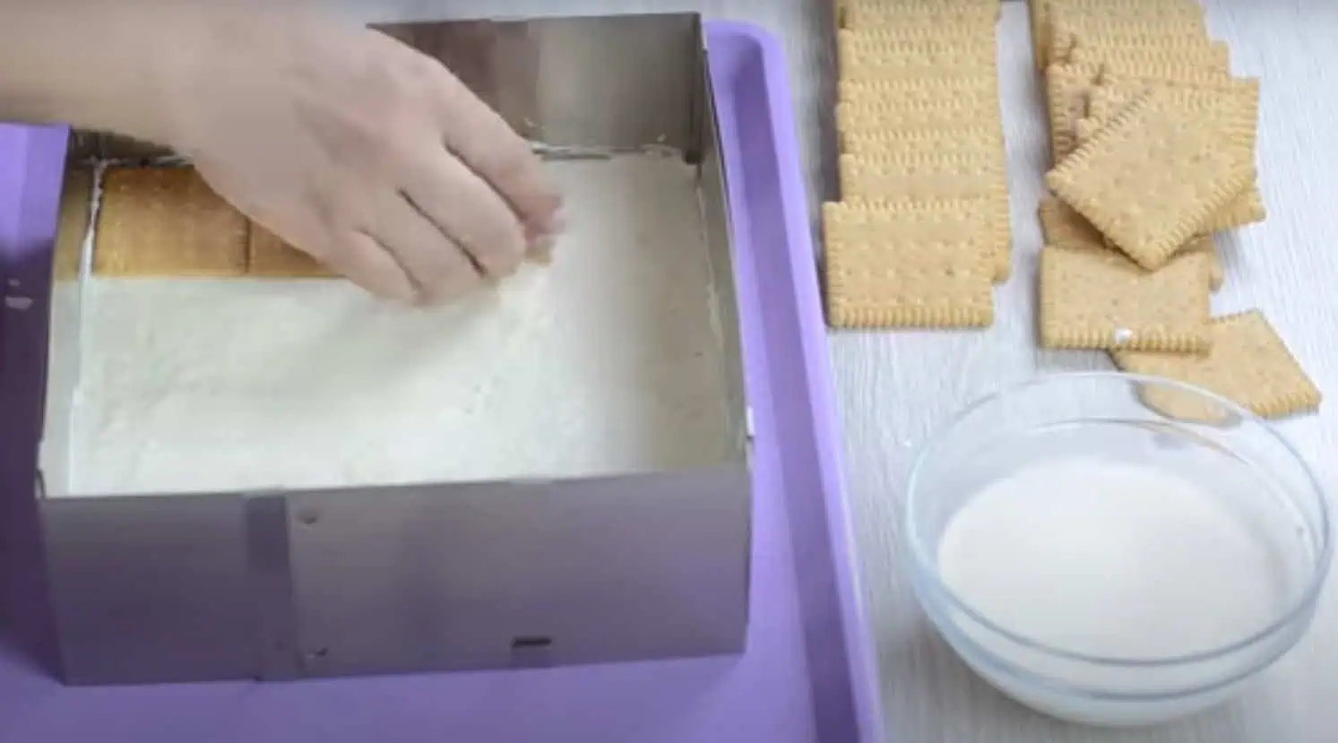 Z vychladnutého krému dáme dolu potravinársku fóliu, potom vyšľaháme ručným šľahačom a zašľaháme zmäknuté maslo. Do formy si naukladáme sušienky namočené v mlieku, navrstvíme na ne krém, ktorý uhladíme a naukladáme ďalšiu vrstvu sušienok.
