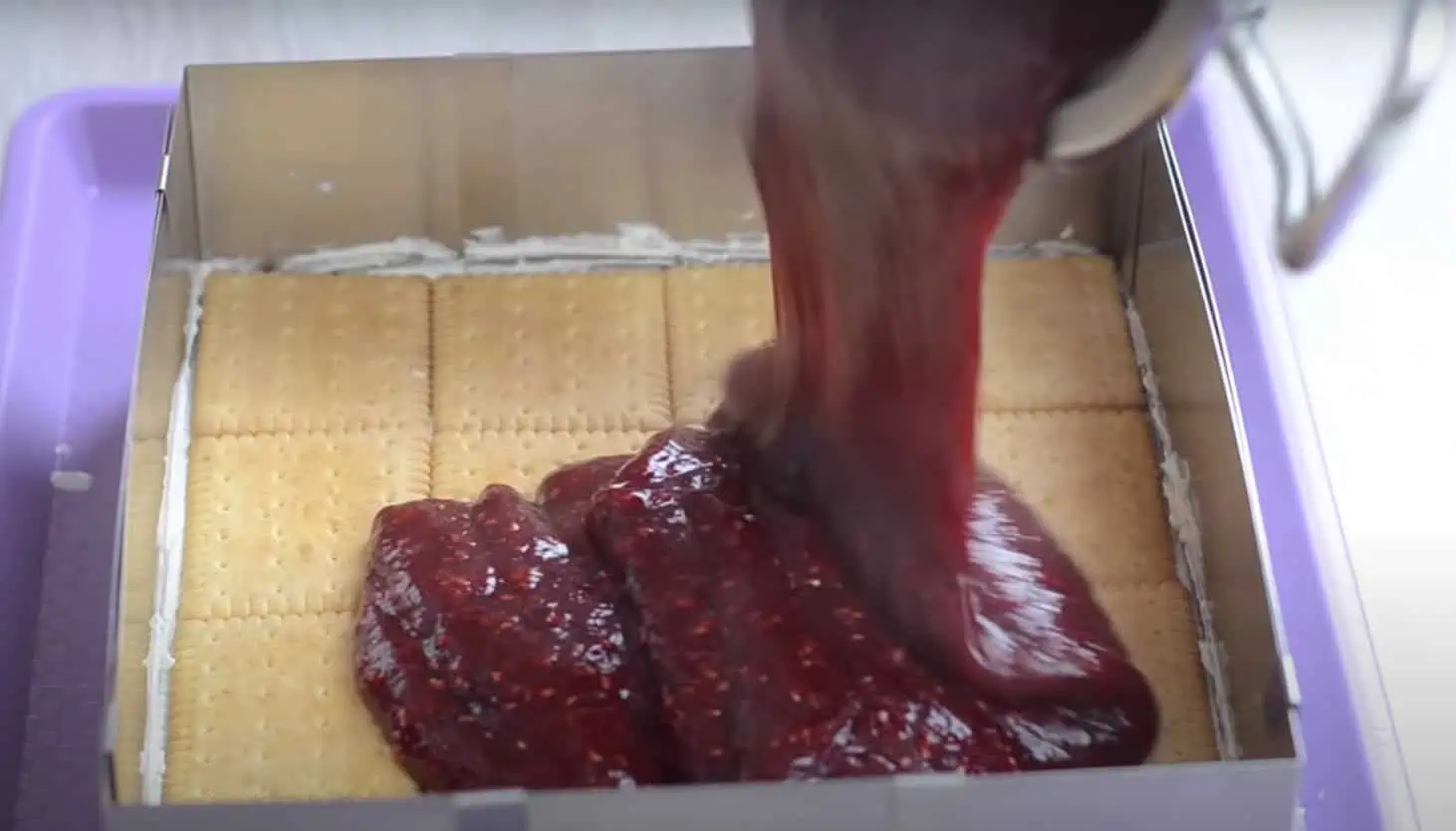 Na malinový krém nasypeme do misky malinový puding, zalejeme 100 ml mlieka a dobre premiešame. Do hrnca si nasypeme maliny, pridáme cukor, vodu a privedieme do varu. Potom odstavíme a pridáme malinový puding. Za stáleho miešania uvaríme hustý krém a nalejeme ho na sušienkovú vrstvu.