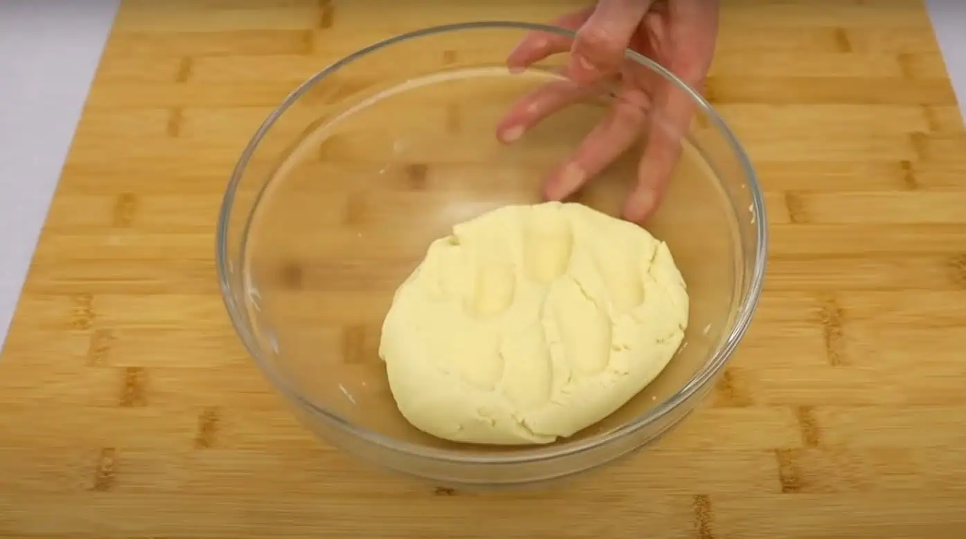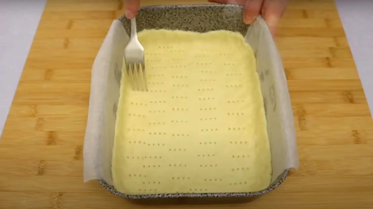 Cesto preložíme na plech pokrytý papierom na pečenie a natlačíme ho rovnomerne na dno, aj na boky.