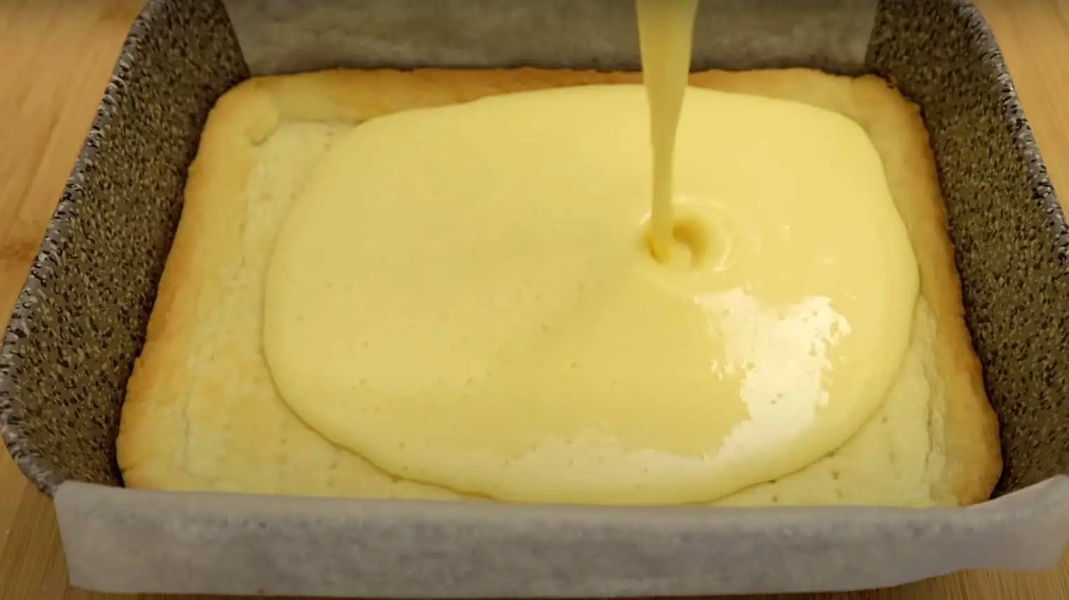 Upečené cesto vyberieme z rúry a nalejeme naň pripravený krém.