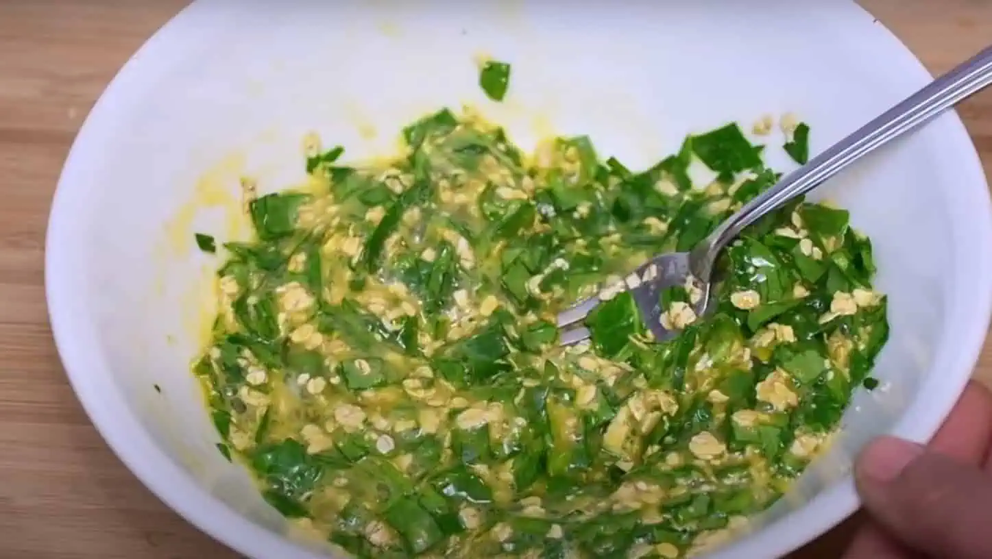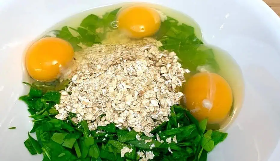 Špenát si dobre umyjeme, osušíme, nakrájame na malé kúsky a vložíme do misy. Pridáme ovsené vločky, vajíčka, soľ, korenie a dobre premiešame.