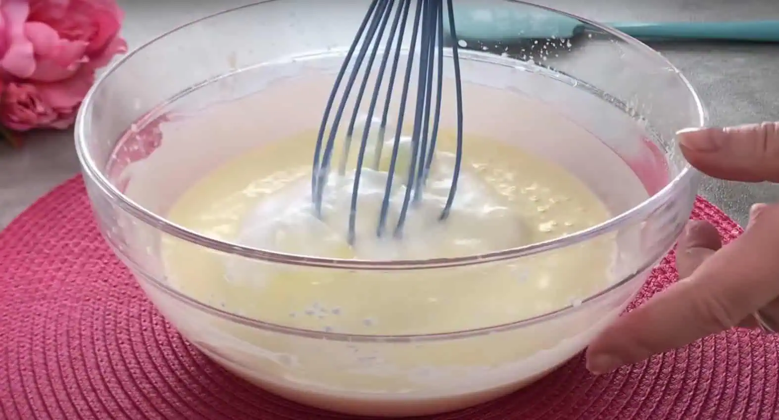 Pridáme ju do hmoty spolu s jogurtom a znovu prešľaháme.