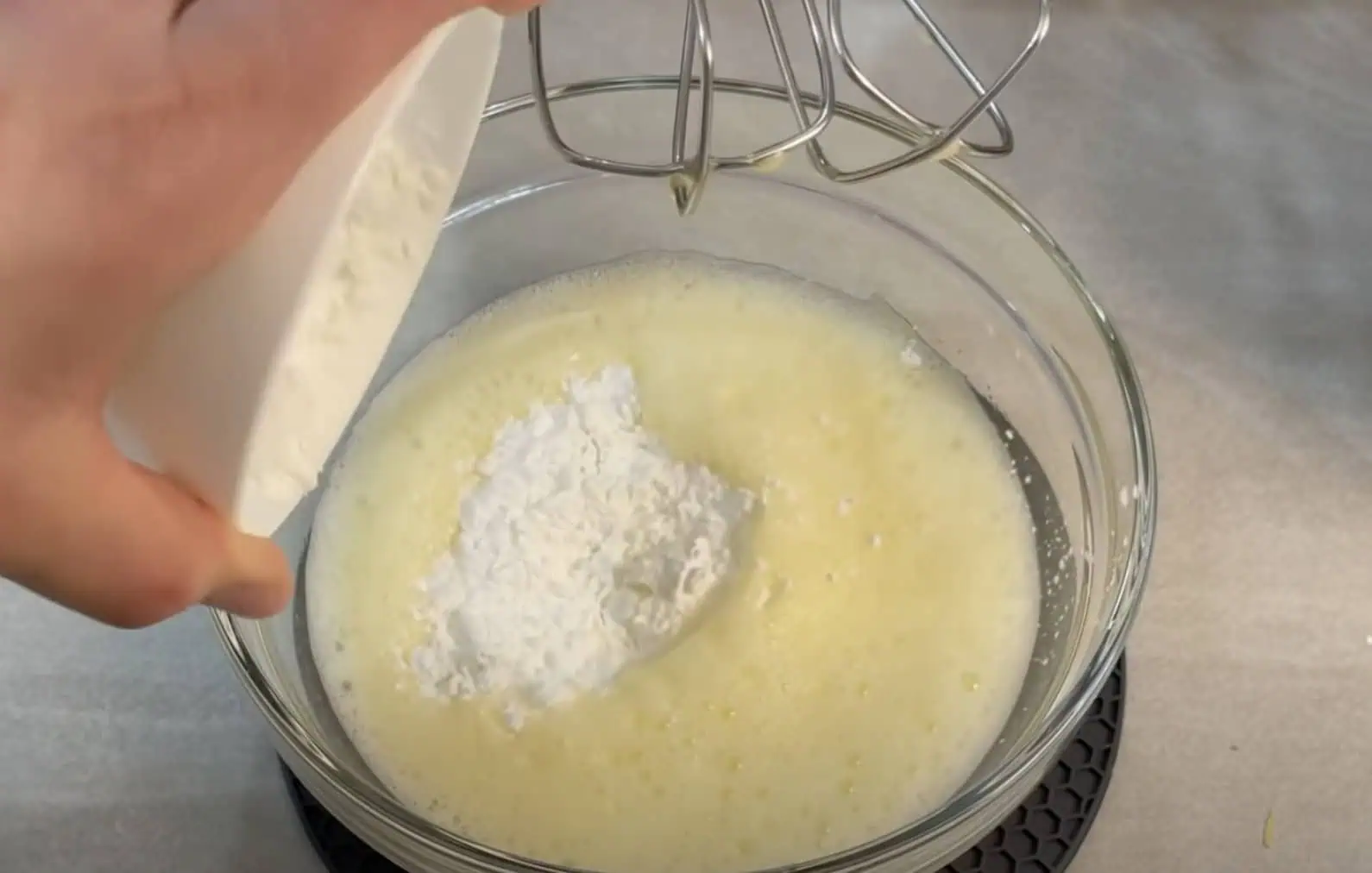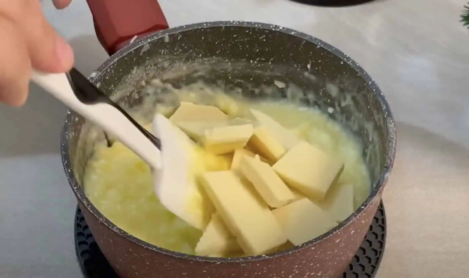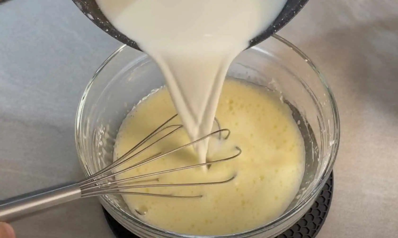 V samostatnej miske rozšľaháme vajcia s cukrom a škrobom. Do tejto zmesi vmiešame vriacu mliečnu zmes a potom všetko spolu preložíme späť na plameň a uvaríme hustý puding.