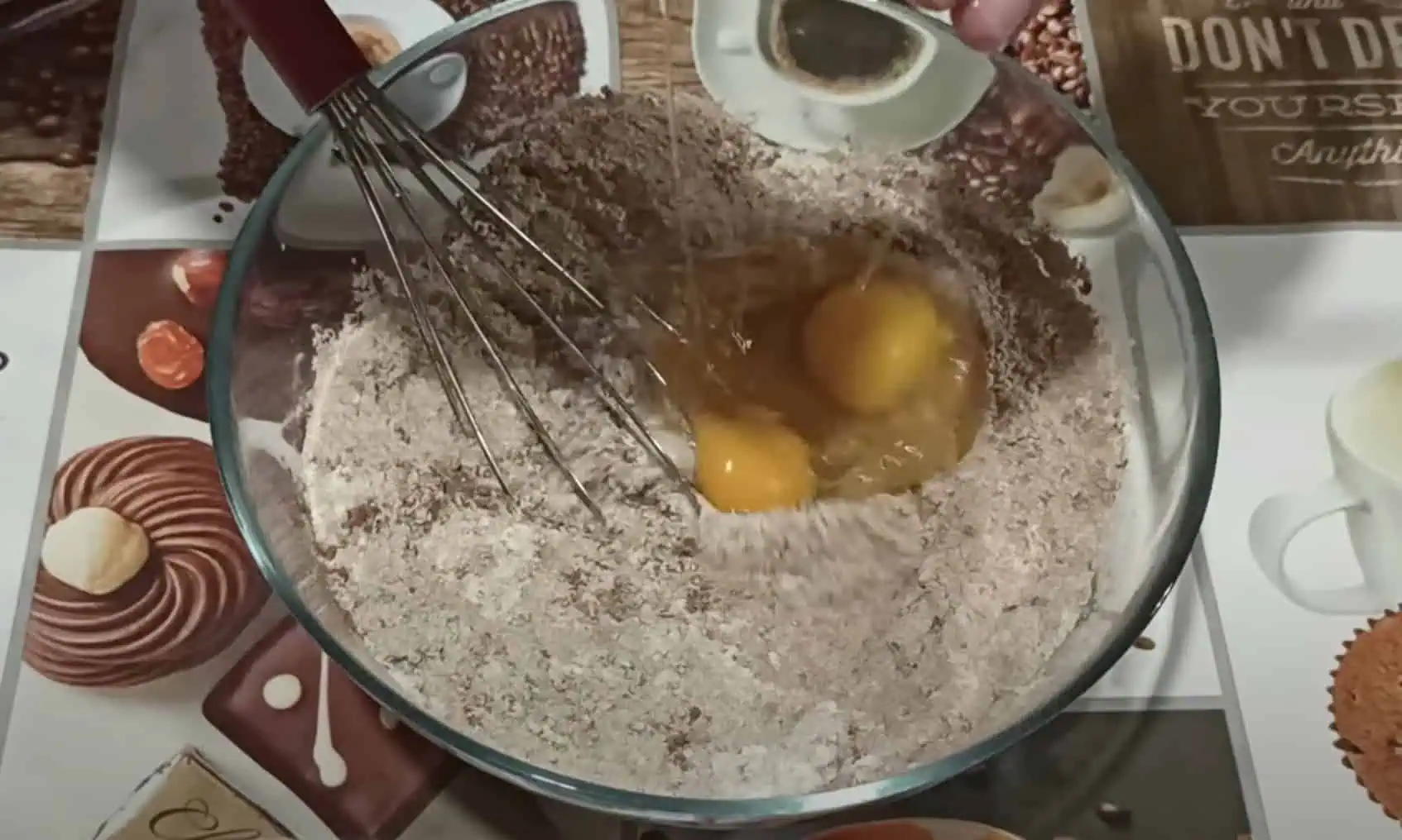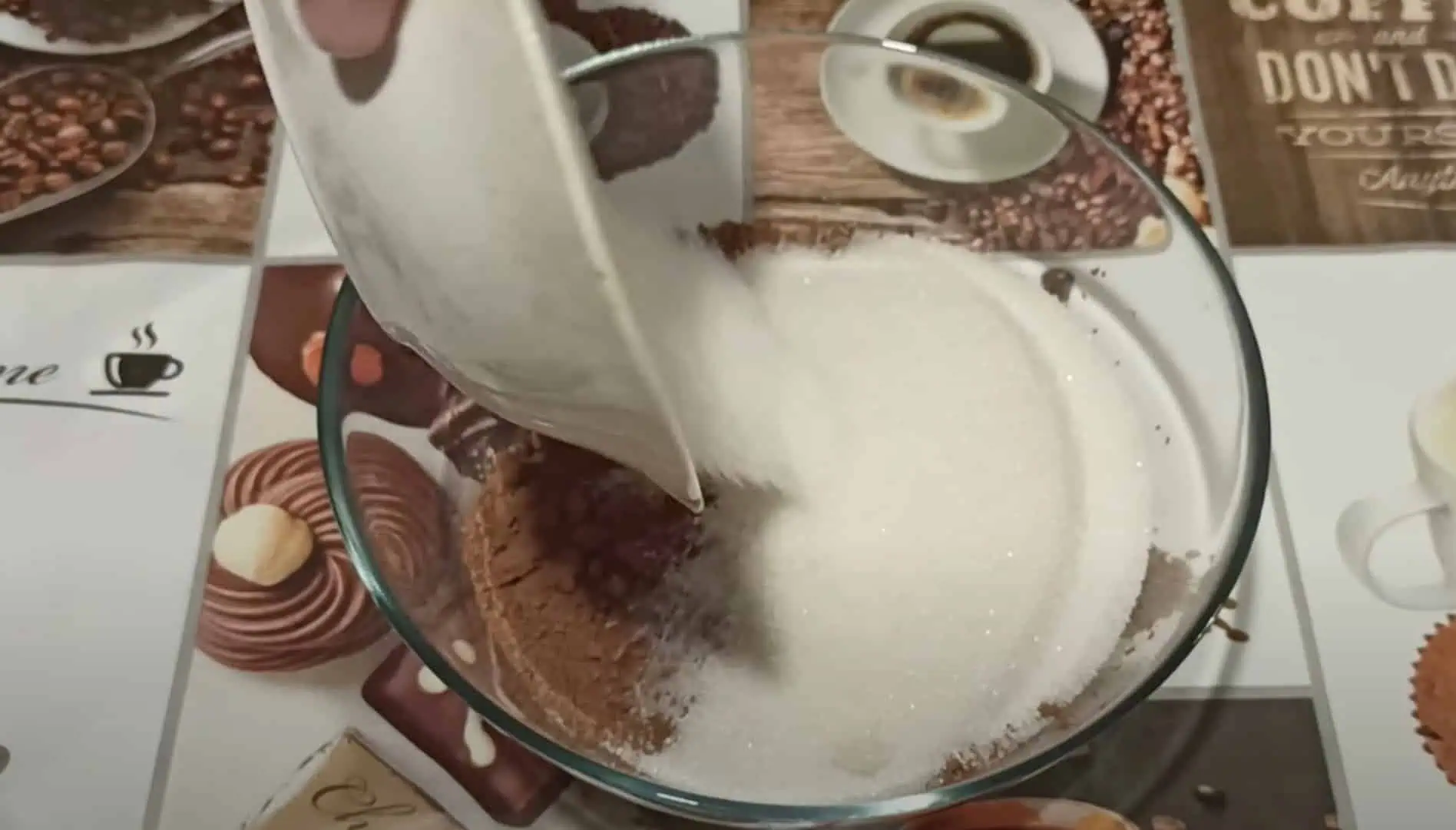 Nachystáme si misku v ktorej zmiešame sypké prísady – preosiatu múku, kakao, cukor, prášok do pečiva a vanilku.