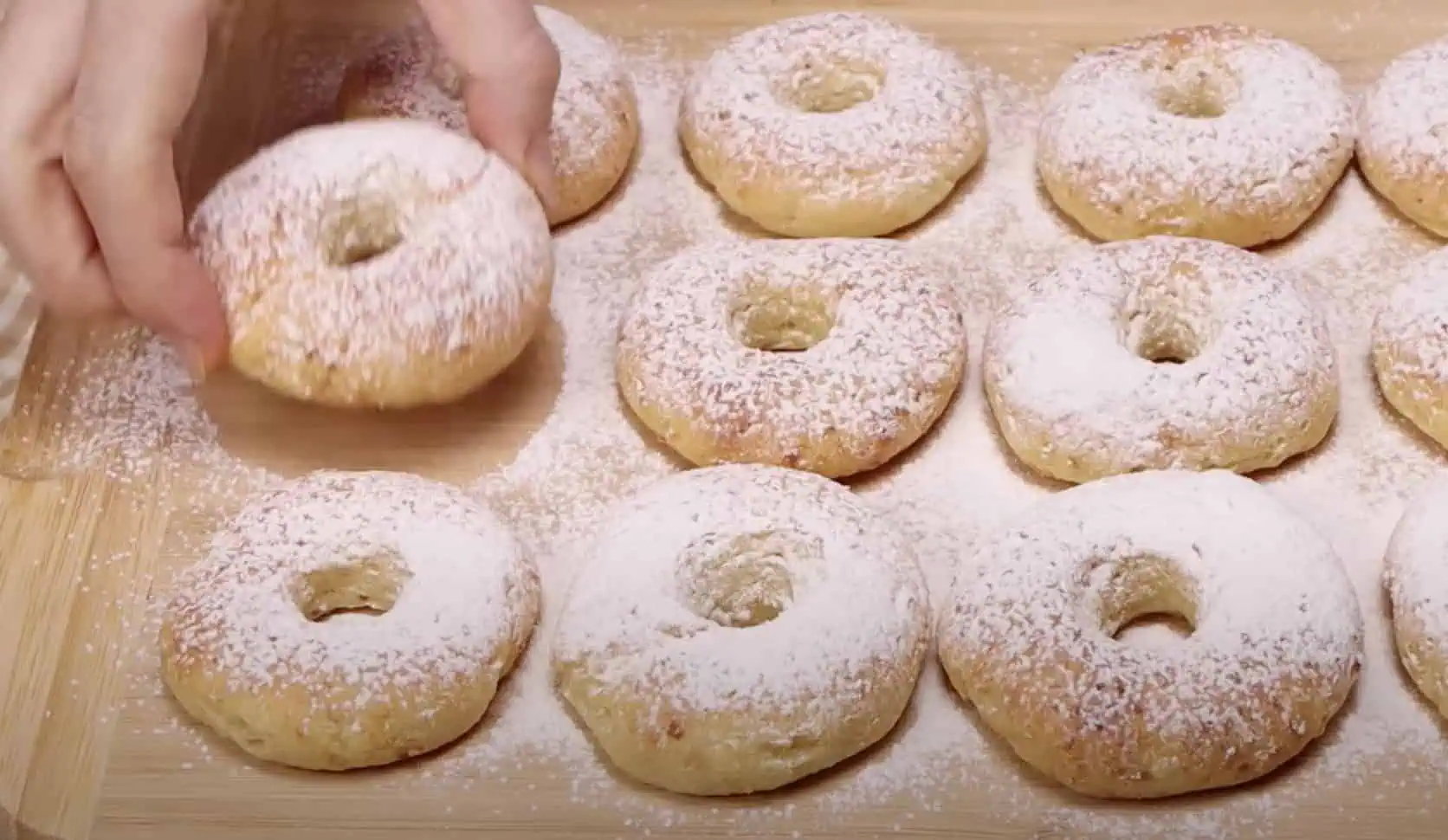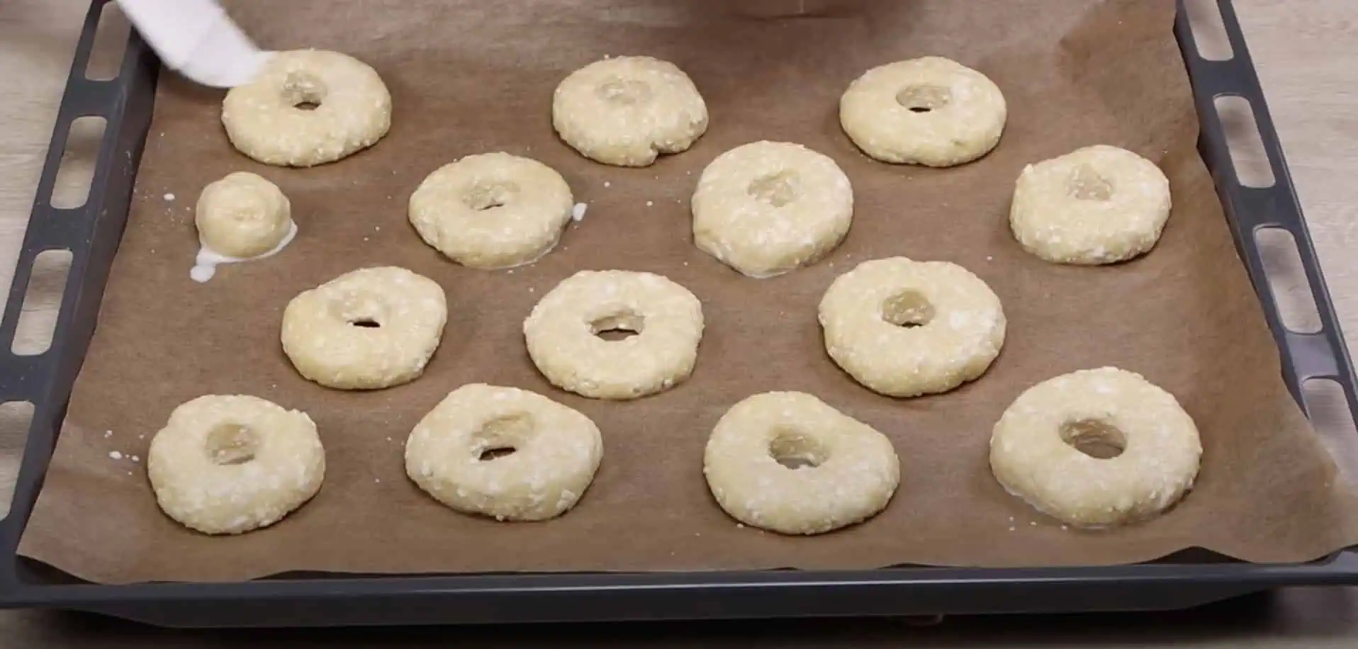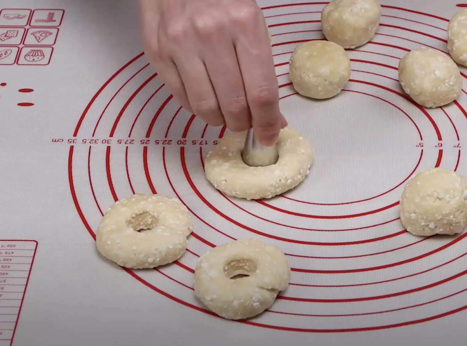 Každý kúsok roztlačíme na placku a stred vykrojíme. Zvyšok cesta môžeme vyformovať do tvaru guľôčky.