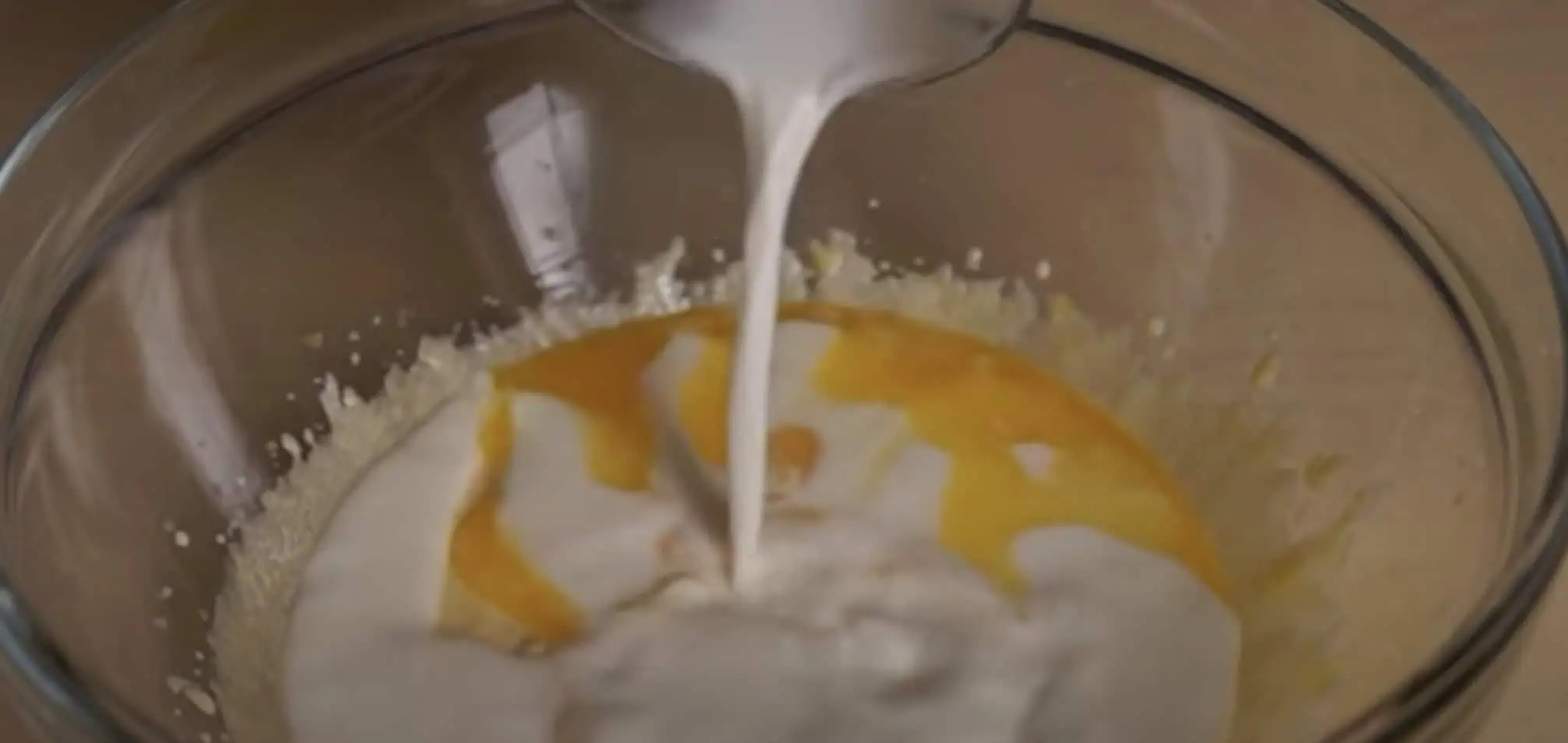 Pridáme rozpustené maslo, mlieko, kypriaci prášok do pečiva, vanilkový cukor, soľ a múku.
