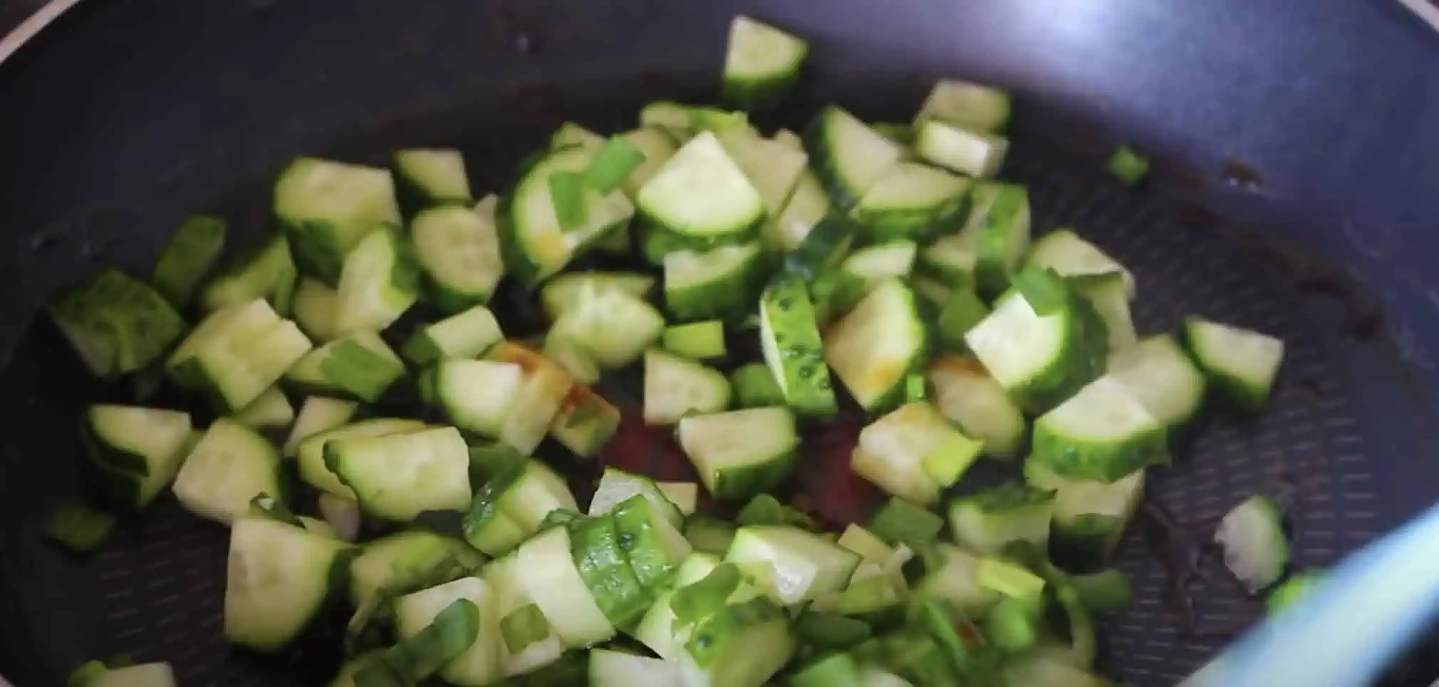 Do zmesi pridáme nakrájanú uhorku a chvíľku necháme na panvici, aby sa spojila s omáčkou.