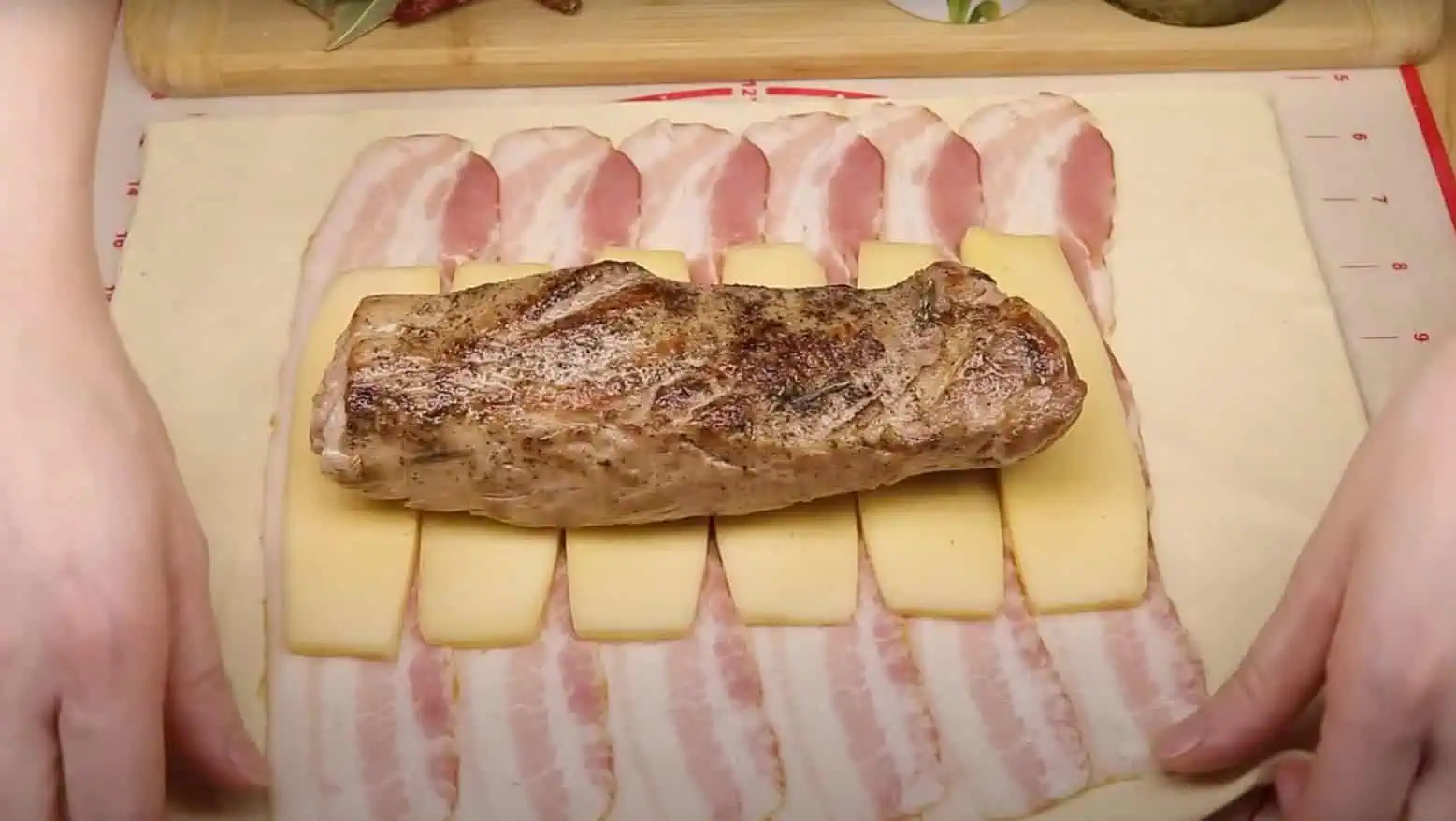 Rozložíme naň plátky slaniny, aj plátky syra a panenku položíme na ne.
