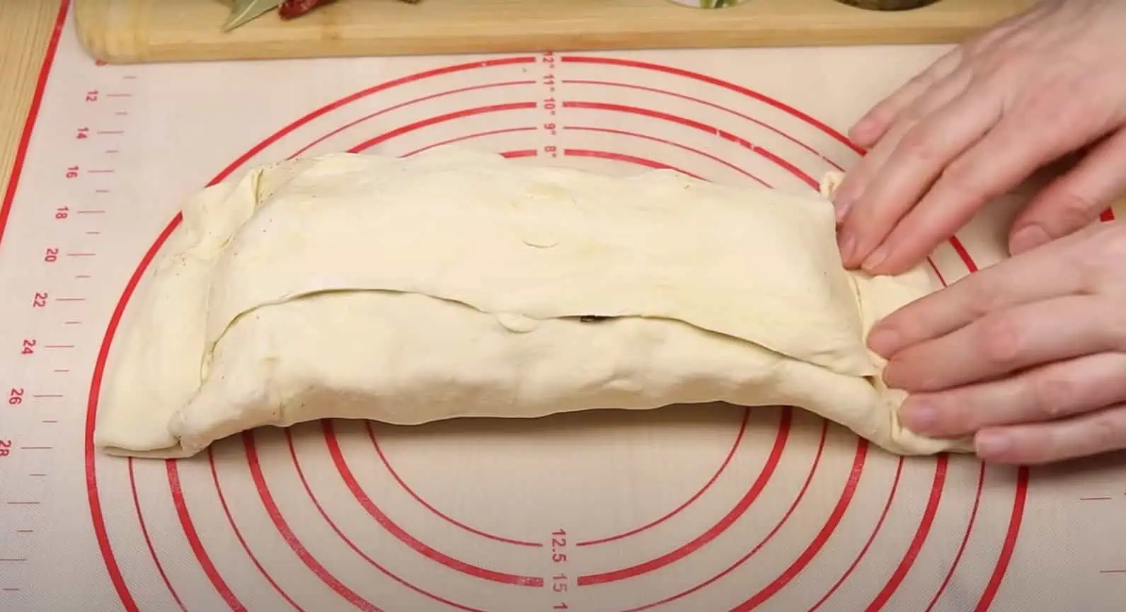 Plech si pokryjeme papierom na pečenie a preložíme naň mäso zabalené v ceste.