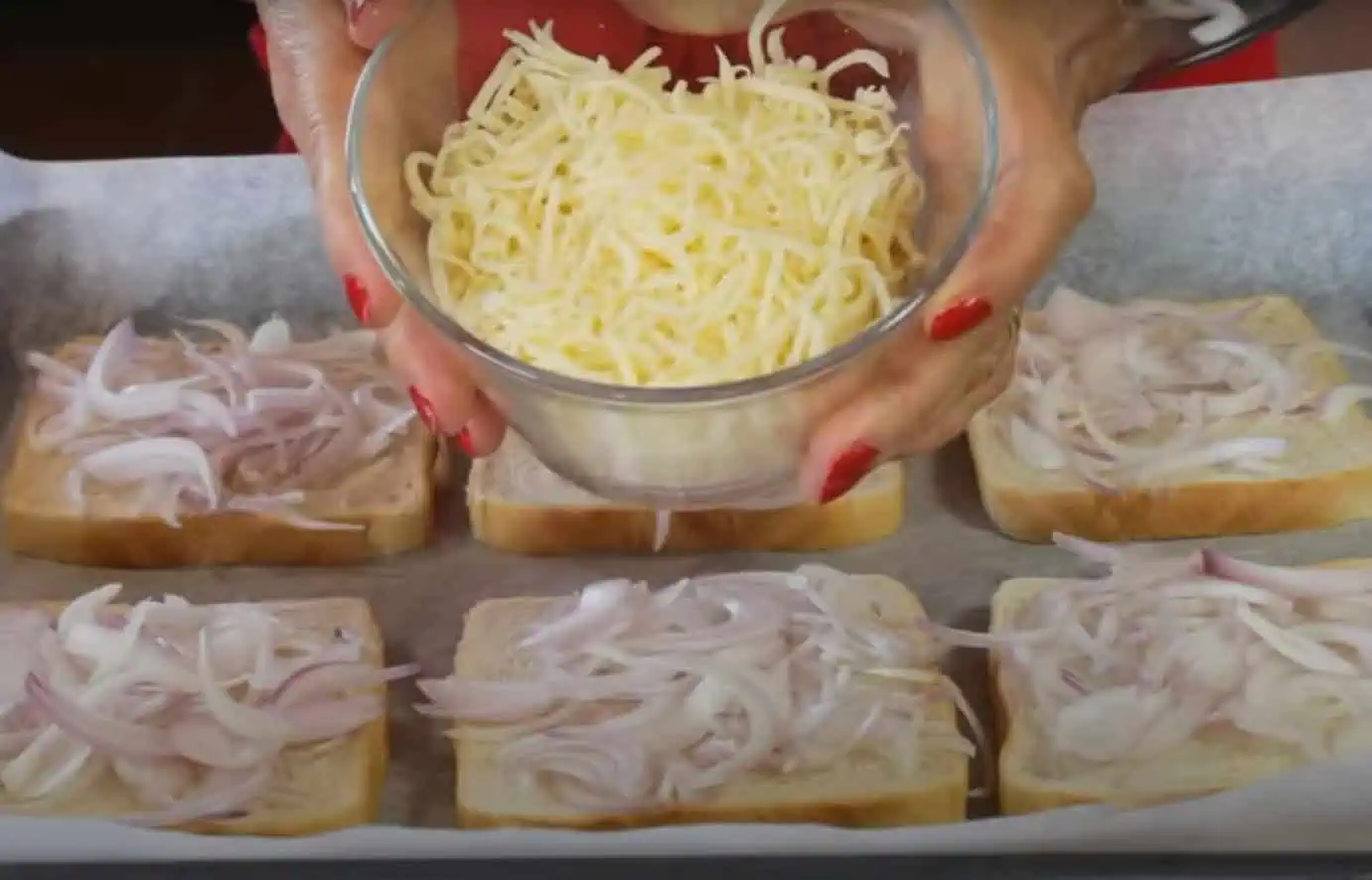 Plech si pokryjeme papierom na pečenie, naukladáme naň plátky chleba a na ne navrstvíme prúžky cibule.