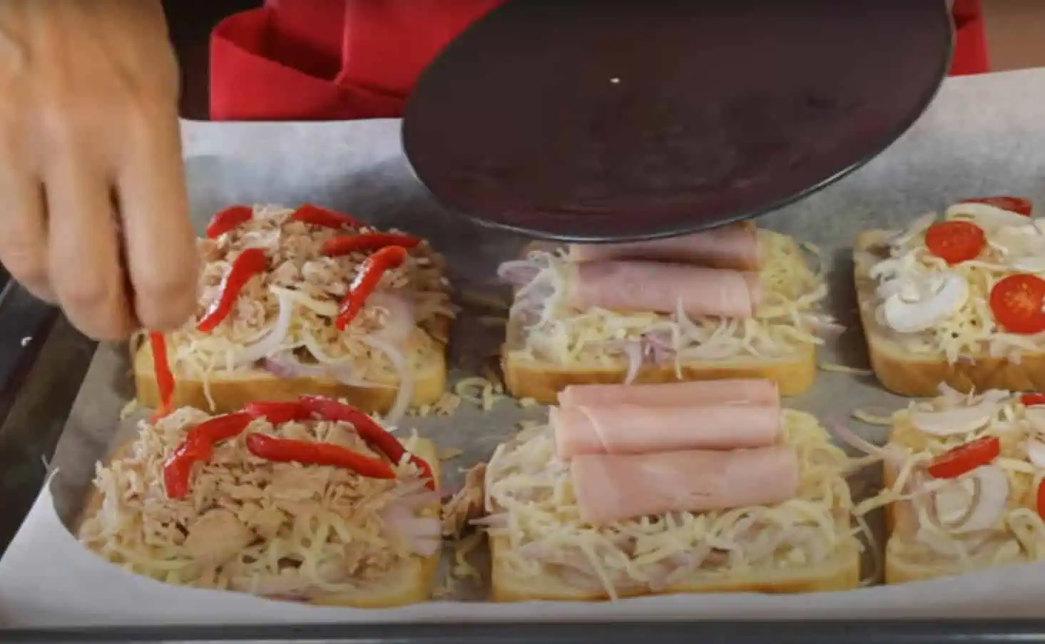 Na niektoré chlebíky naukladáme šunku, na ďalšie dva šampiňóny, cherry paradajky a na dva zvyšné chlebíky navrstvíme tuniaka, ktorého skombinujeme s prúžkami opečenej červenej papriky.