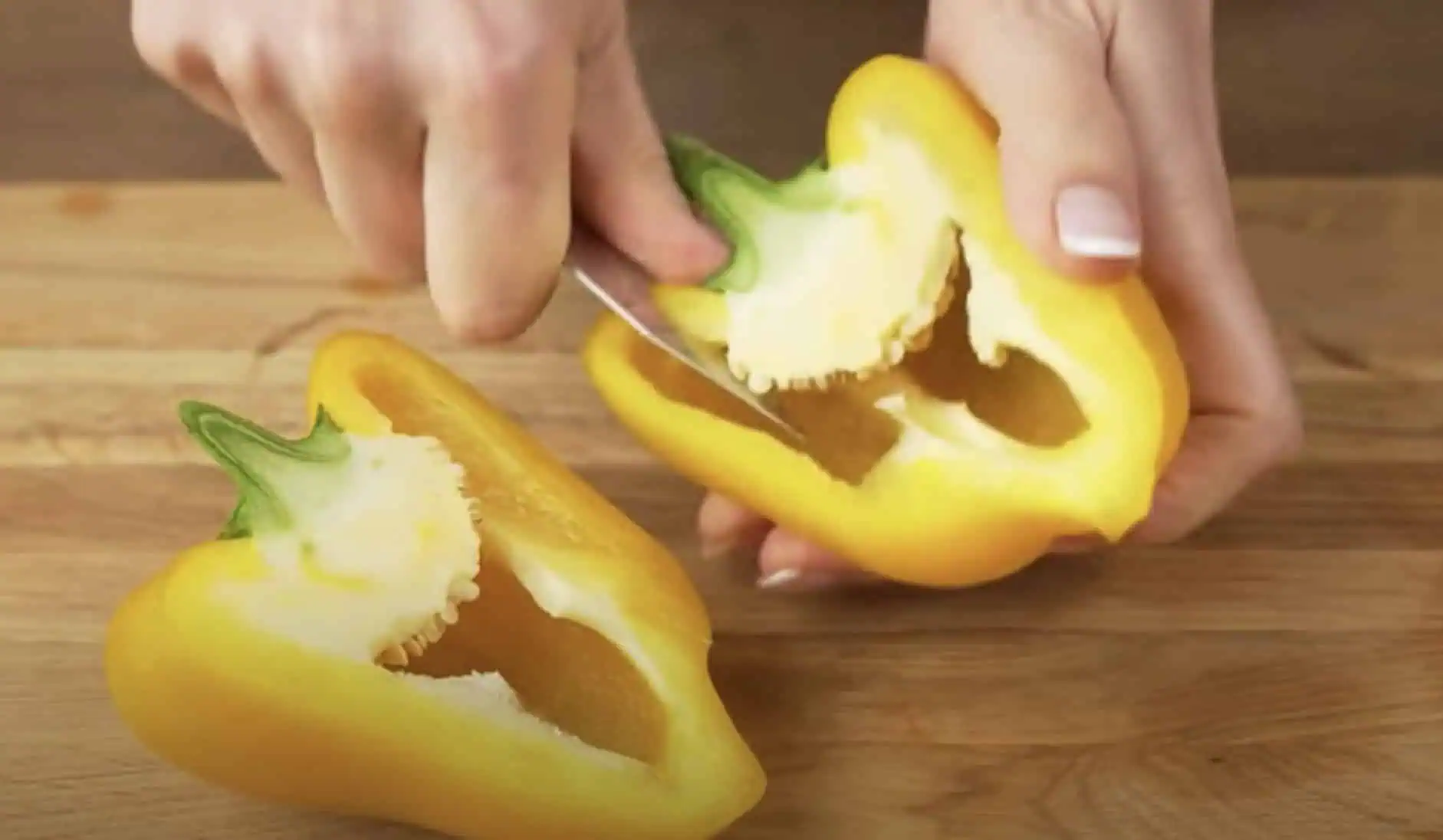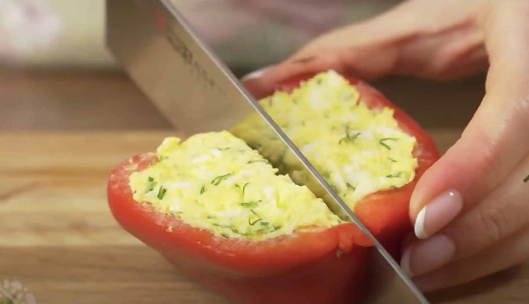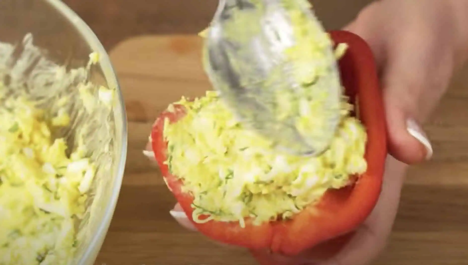 Náplň navrstvíme do vnútra papriky, dôkladne natlačíme do vnútra papriky.