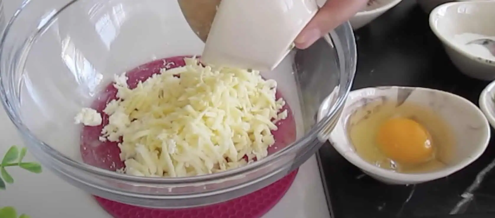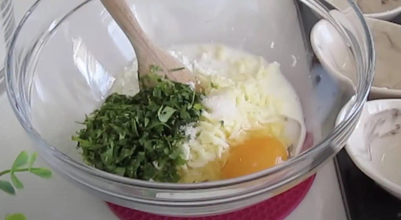 Pridáme strúhaný syr, vajce, nasekanú petržlenovú vňať, mlieko a olej.