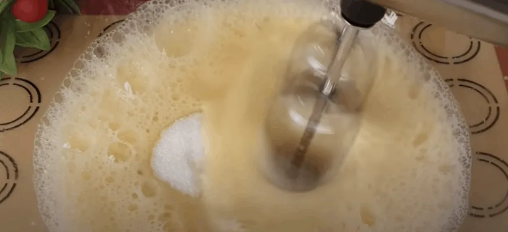 V inej mise vyšľaháme do nadýchanej peny celé vajcia spolu s práškovým cukrom.