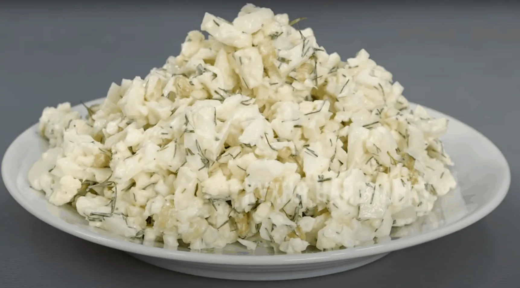 Vložíme do misky, pridáme nasekaný kôpor, píniové oriešky, majonézu, zamiešame a môžeme podávať.