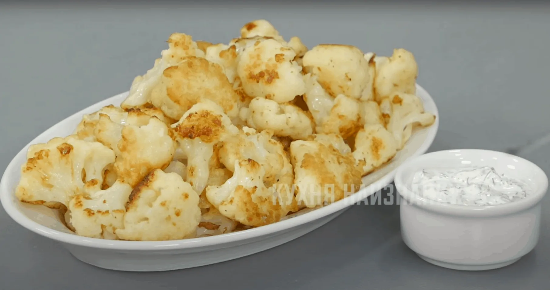 Karfiol rozdelíme na menšie ružičky – nevaríme. Každú ružičku obalíme najskôr v múke, potom vo vajíčku zmiešanom s pretlačeným cesnakom, soľou a horčicou. Nakoniec obalíme v strúhankovo-syrovej zmesi. Ružičky uložíme na plech vymastený olejom a ešte zľahka potrieme olejom zmiešaným s trochou červenej papriky.