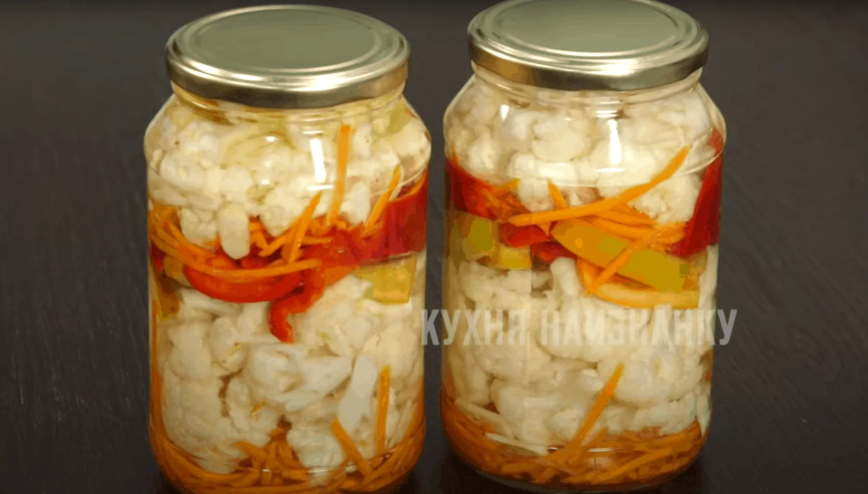 Na dno dáme nahrubo postrúhanú mrkvu, pridáme strúčiky cesnaku a karfiol. Na karfiol dáme prúžky papriky, znovu mrkvu, karfiol a strúčiky cesnaku. Zalejeme nálevom a dobre uzavrieme viečkom.