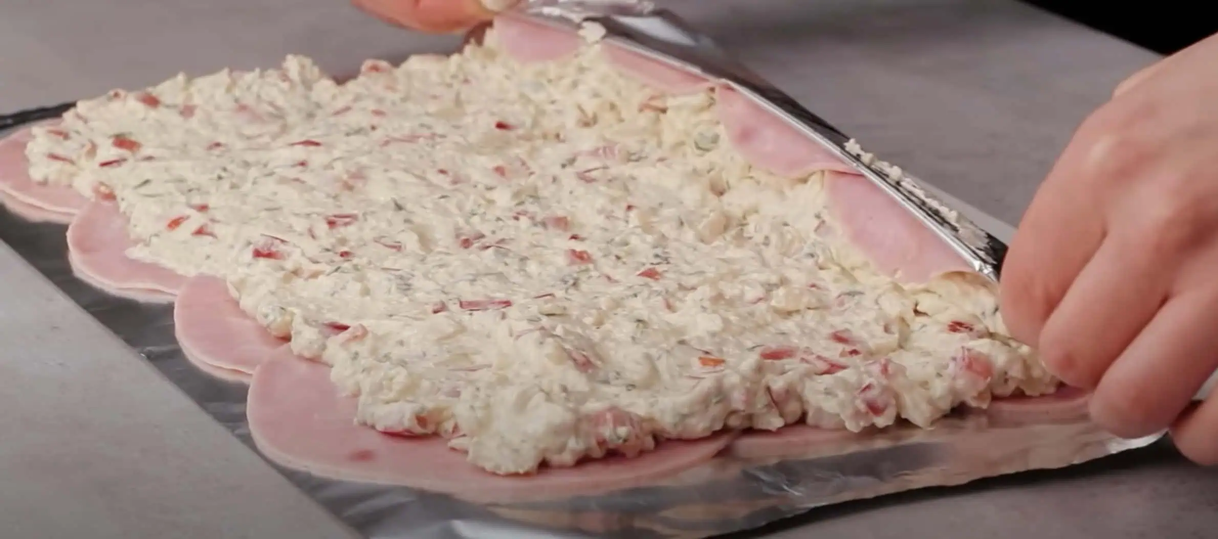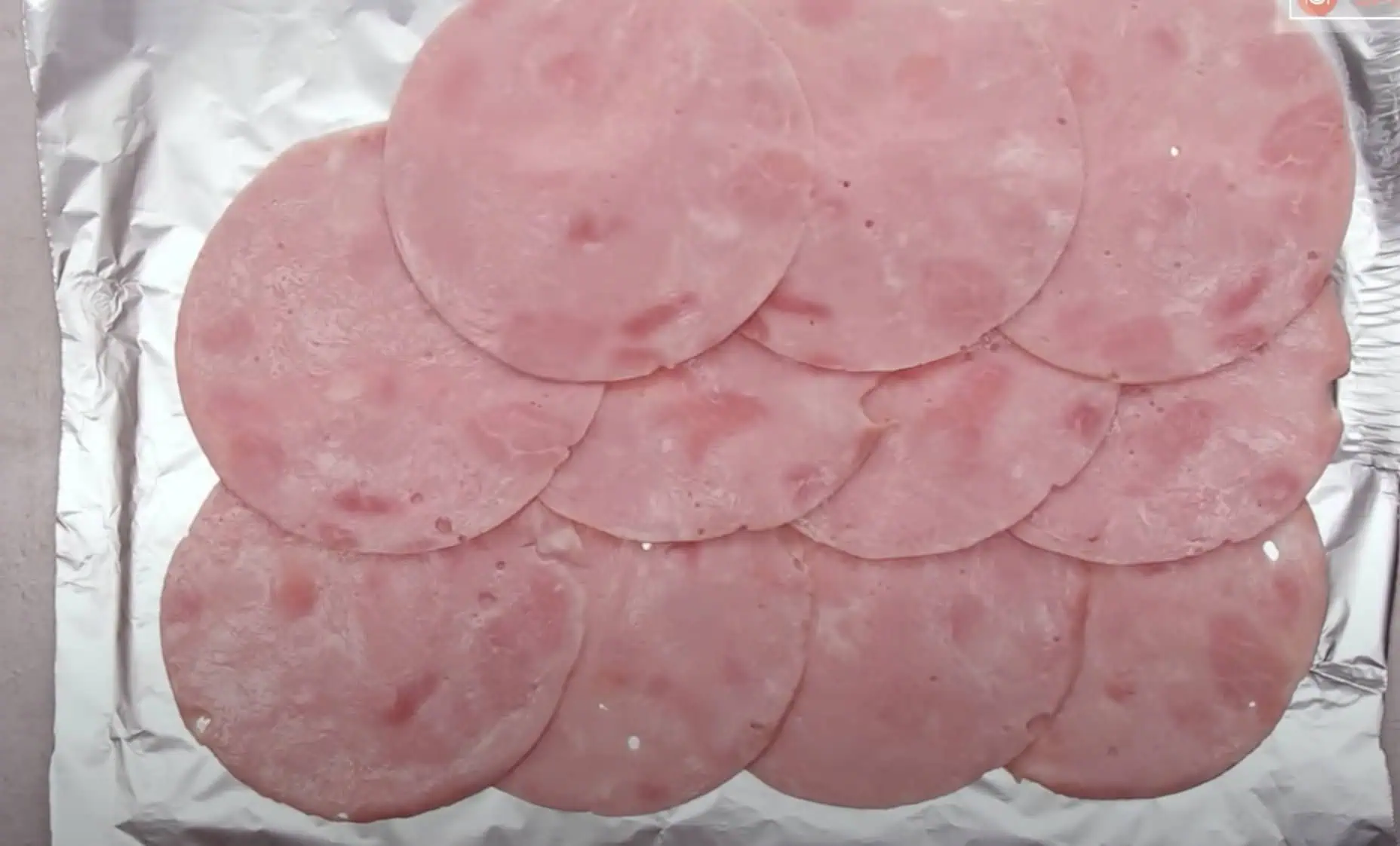 Na alobal rozložíme plátky šunky tak, aby sa čiastočne prekrývali.