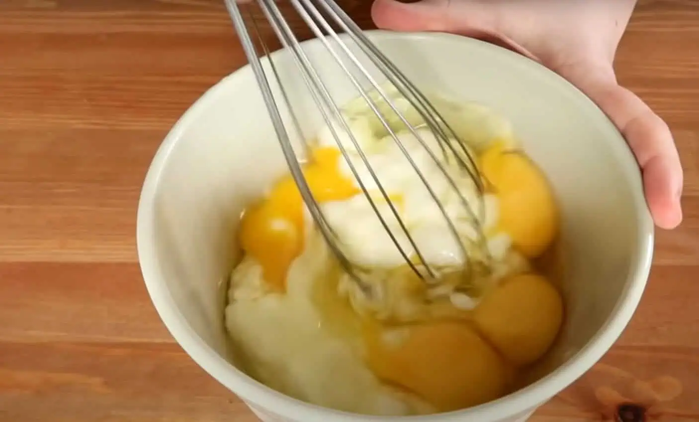 Do misky si dáme jogurt, pridáme vajcia a metličkou dôkladne vyšľaháme, aby sa obe suroviny dobre spojili.