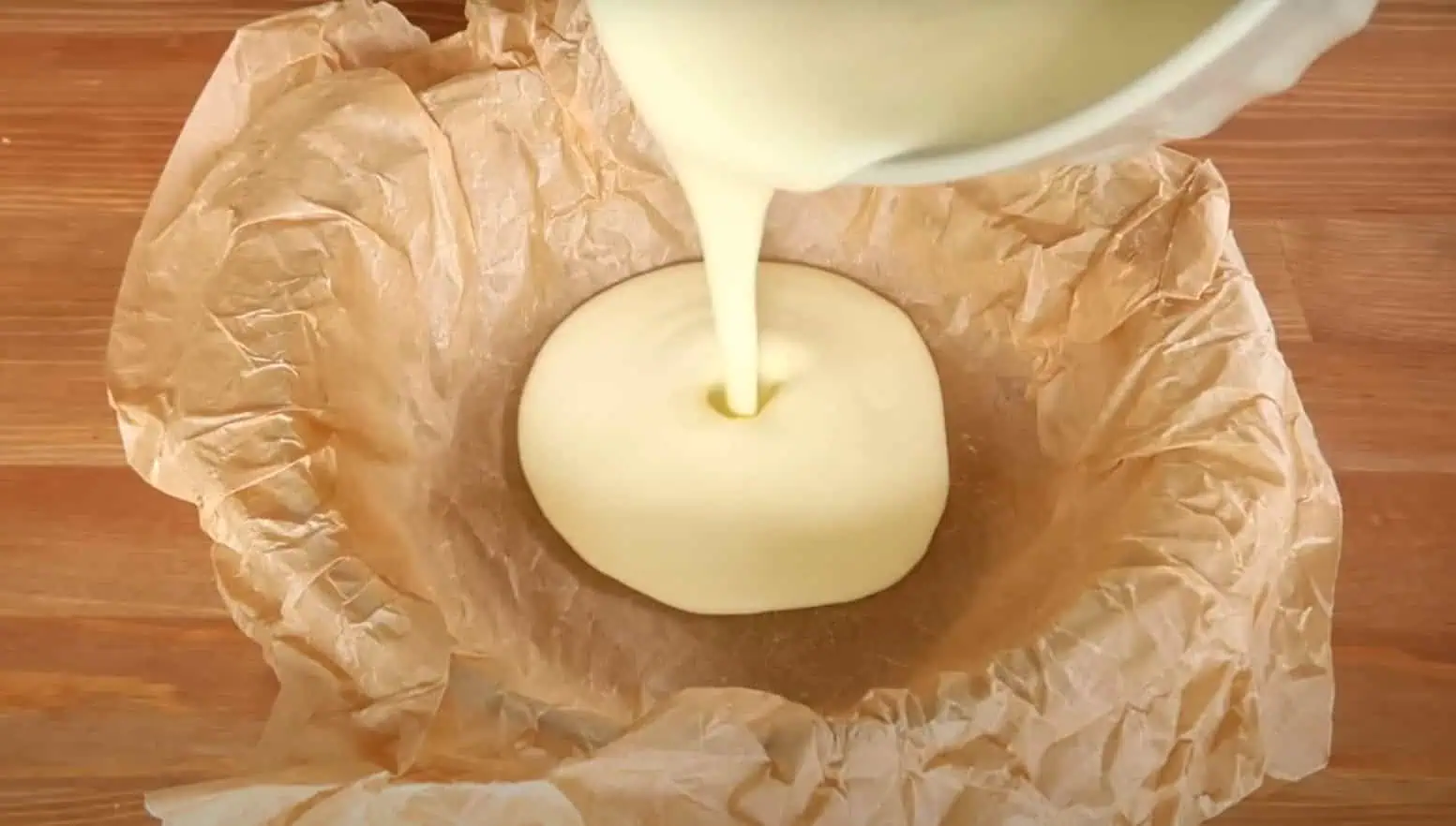Formu s priemerom 18 – 20 cm si navlhčíme vodou a vložíme do nej pokrčený papier na pečenie. Jogurtovú zmes nalejeme do takto pripravenej formy.