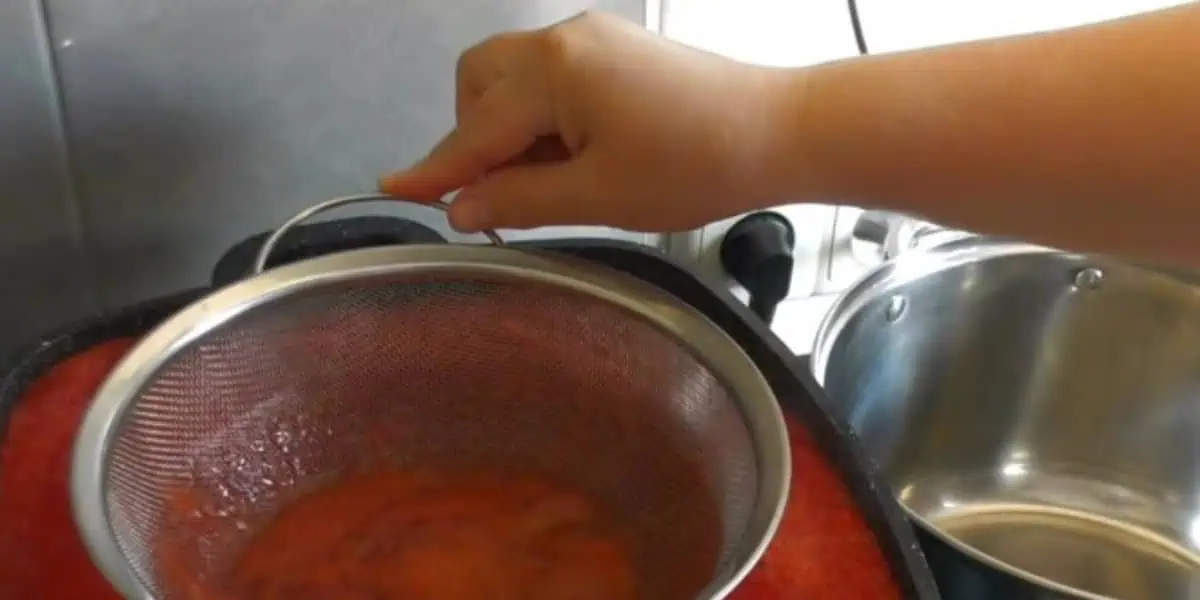 4. Keď paradajky začnú vrieť, stlačte zmes pomocou sitka, aby v ňom stúpla šťava.