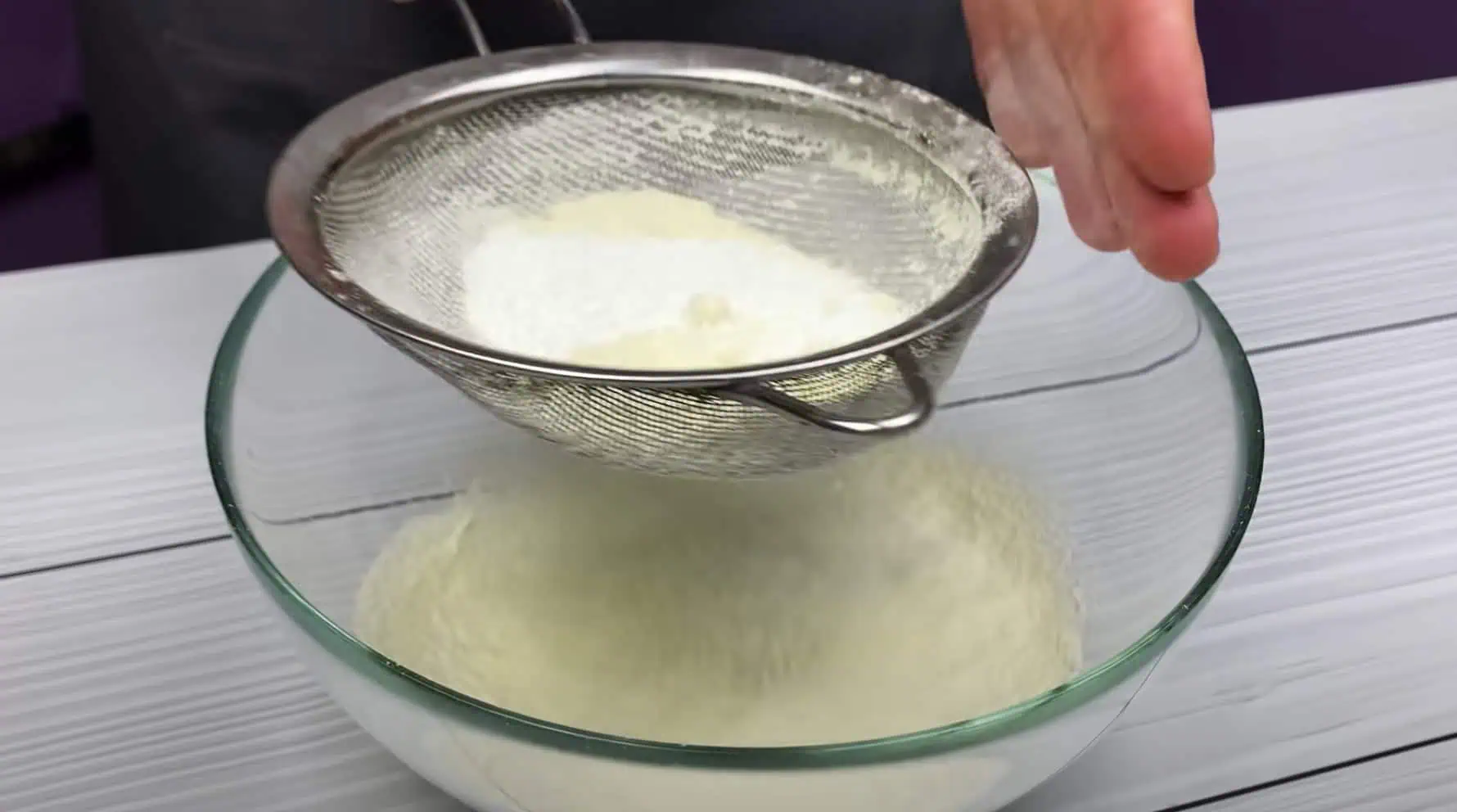 Premiešame preosiatu múku, cukor, prášok do pečiva.