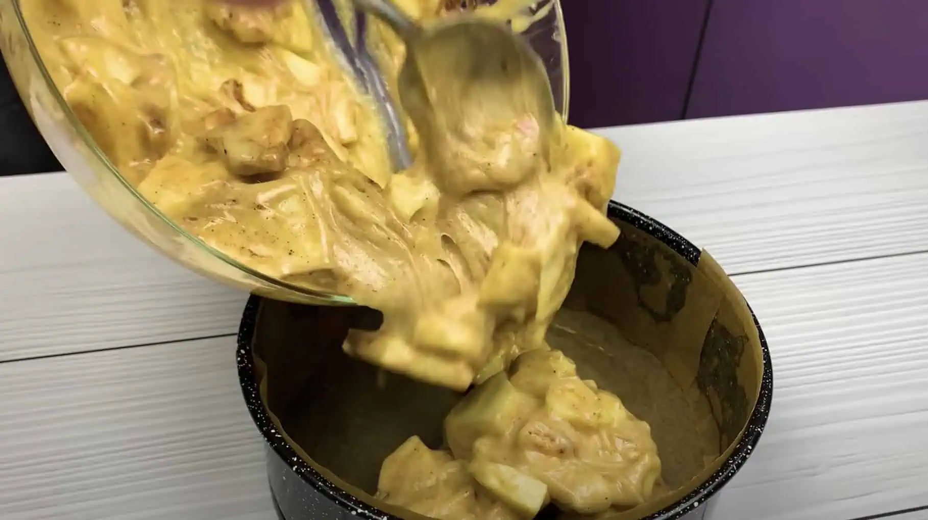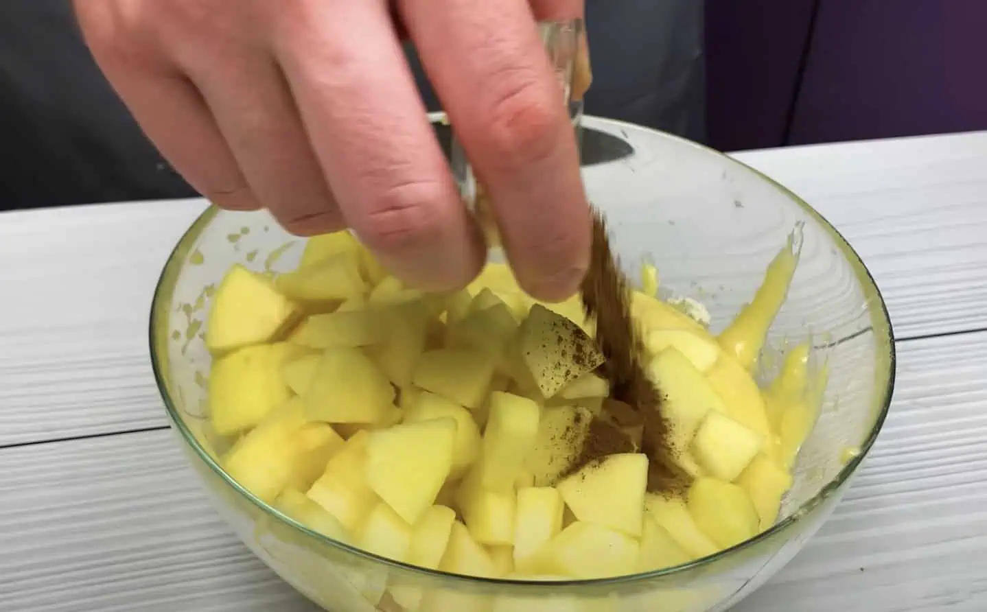 Do cesta pridáme jablká a škoricu – dobre premiešame.