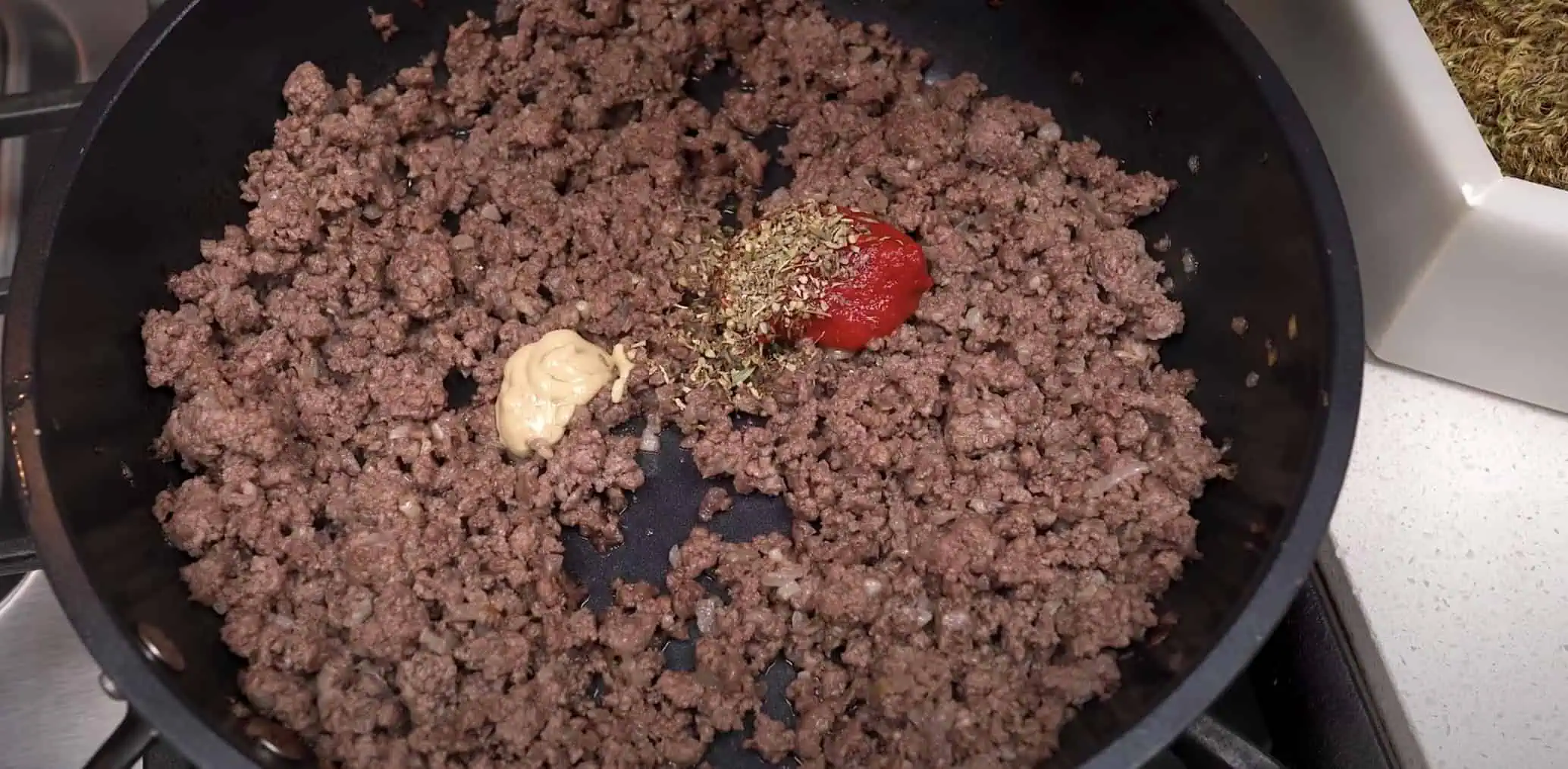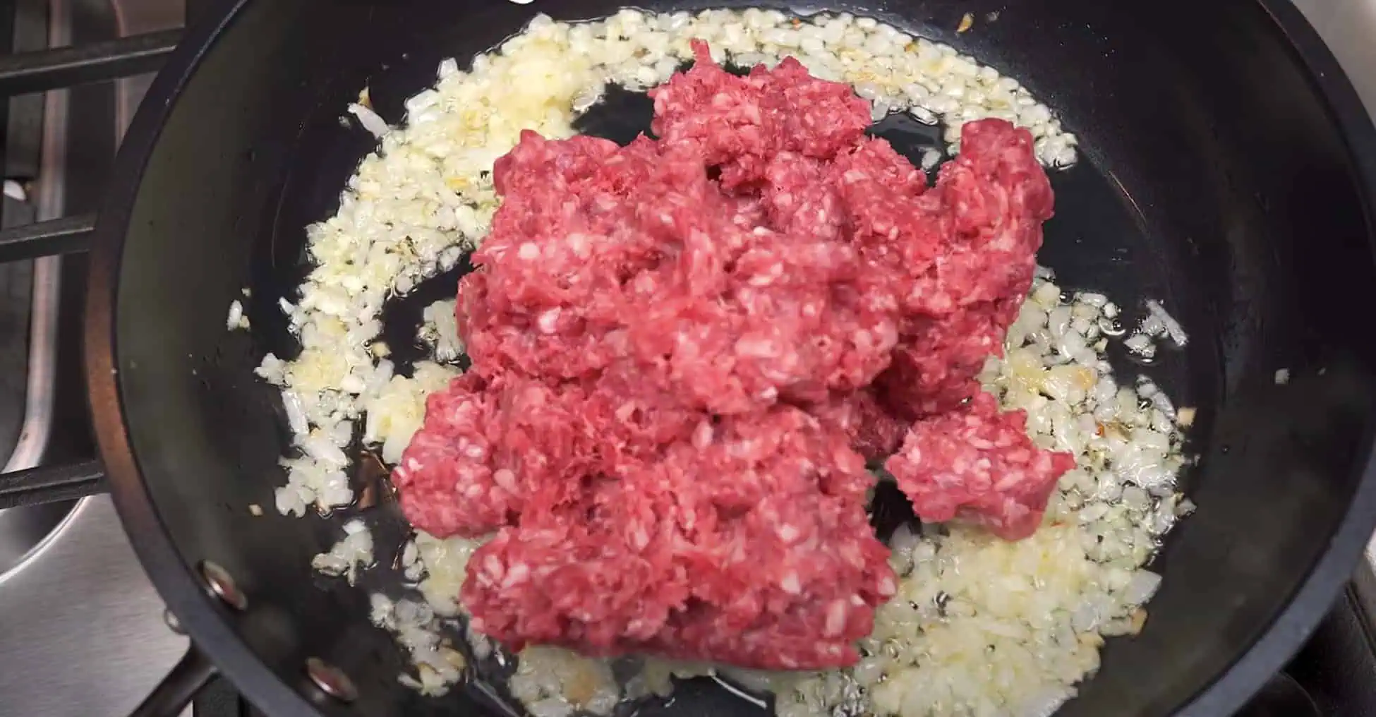 Pridáme mleté mäso a necháme na panvici „zatiahnuť“.