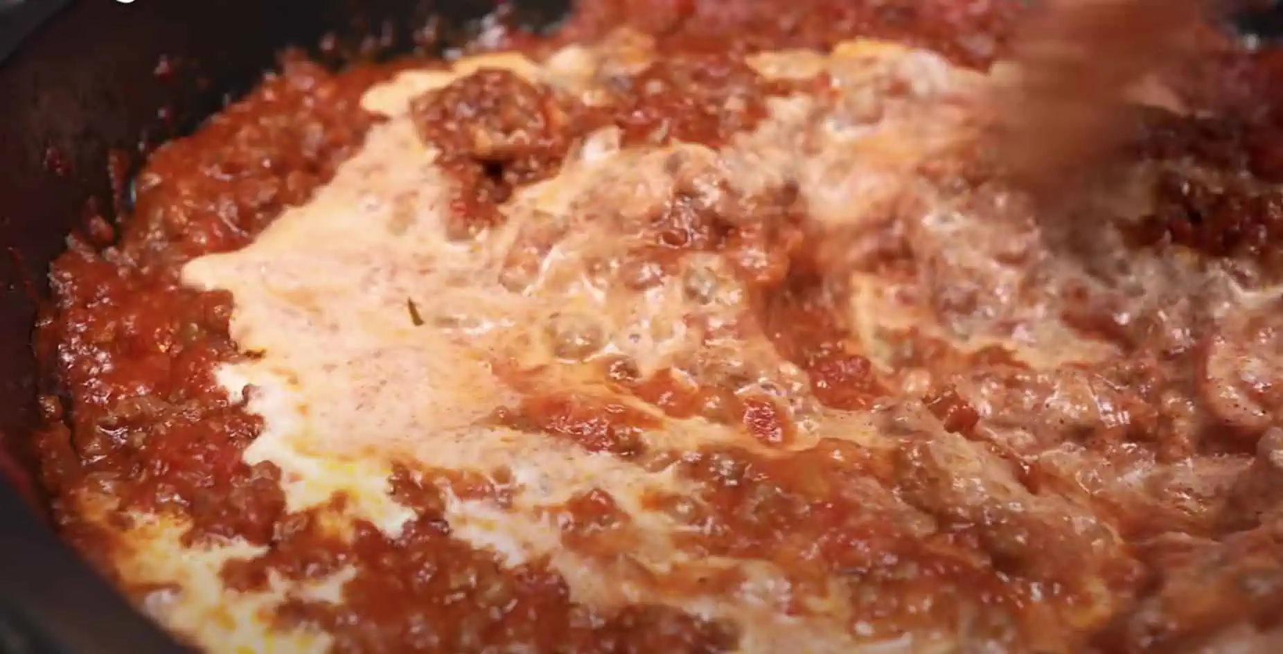 K mäsu pridáme smotanu, necháme prevariť 3 minúty a pridáme cestoviny.