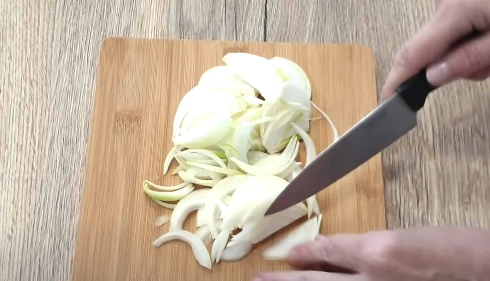 Cibuľu si nakrájame na pol krúžky a vložíme do misky.