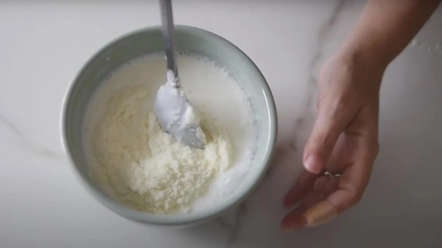 Do misky si preložíme biely jogurt, premiešame ho a zalejeme ho trochou zohriateho mlieka.