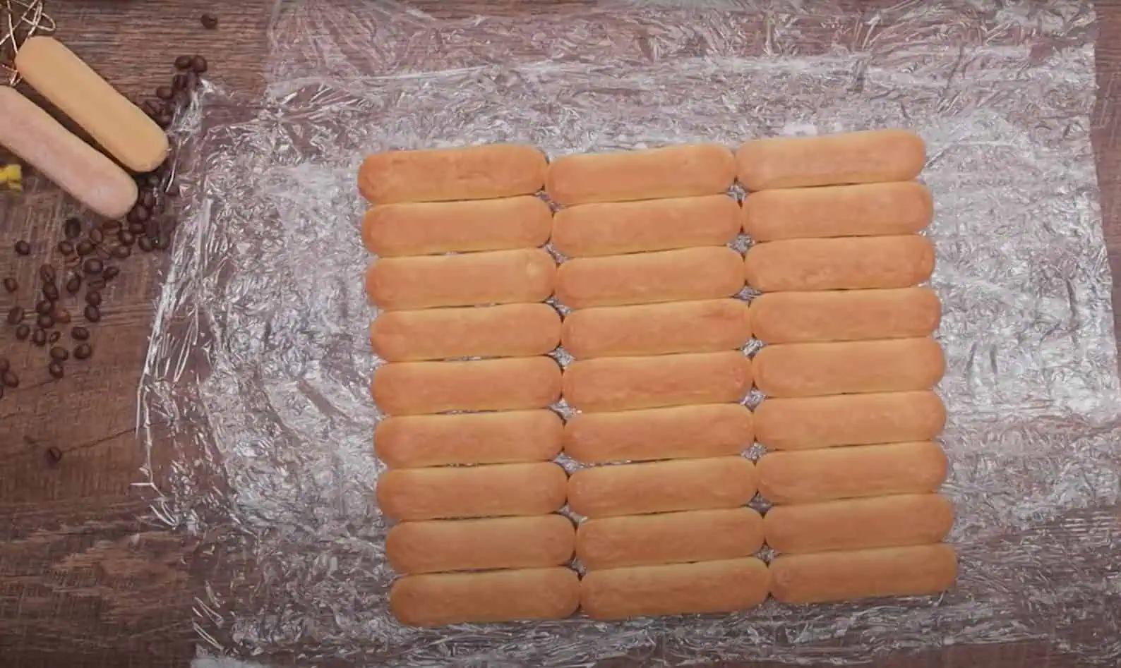 Piškóty si namáčame v mlieku a ukladáme na potravinársku fóliu, ktorou sme si prikryli pracovnú dosku.