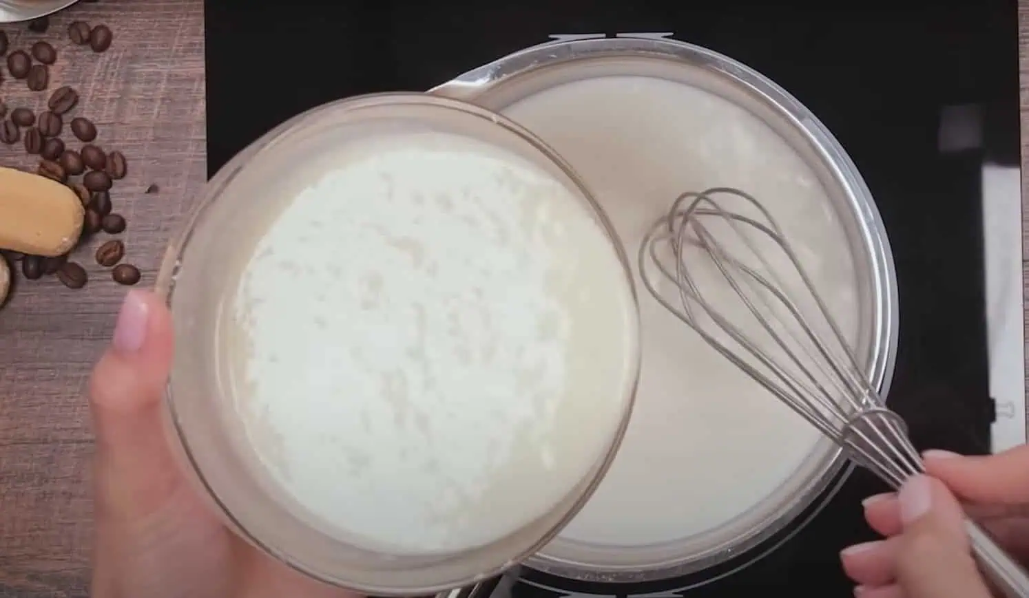 500 ml mlieka si nalejeme do hrnca, dáme na sporák na mierny ohrev a za stáleho miešania nalejeme vajíčkovú hmotu.