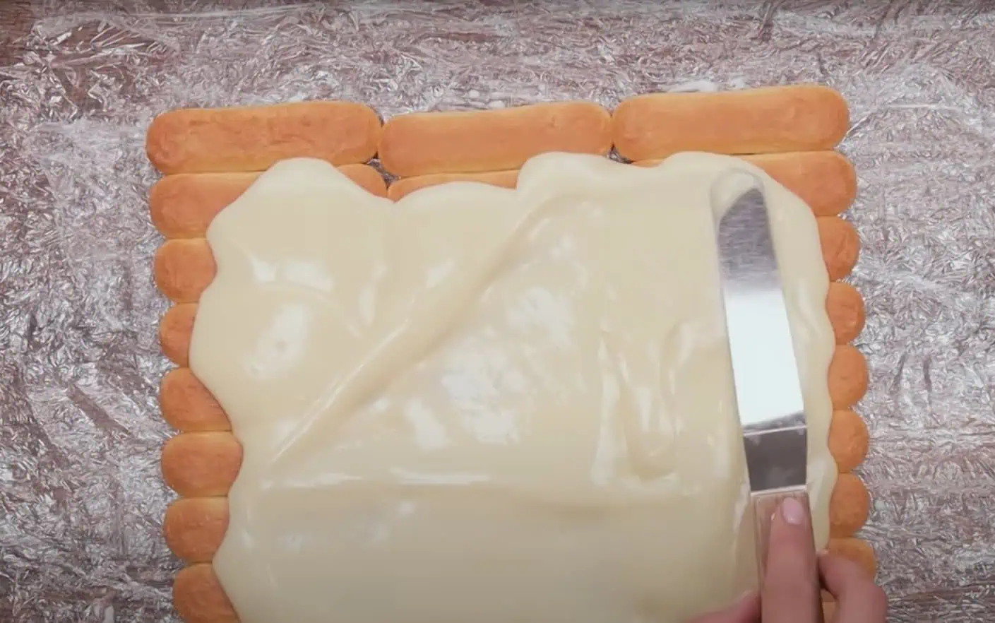 Ešte horúci krém rovnomerne rozotrieme na piškóty.