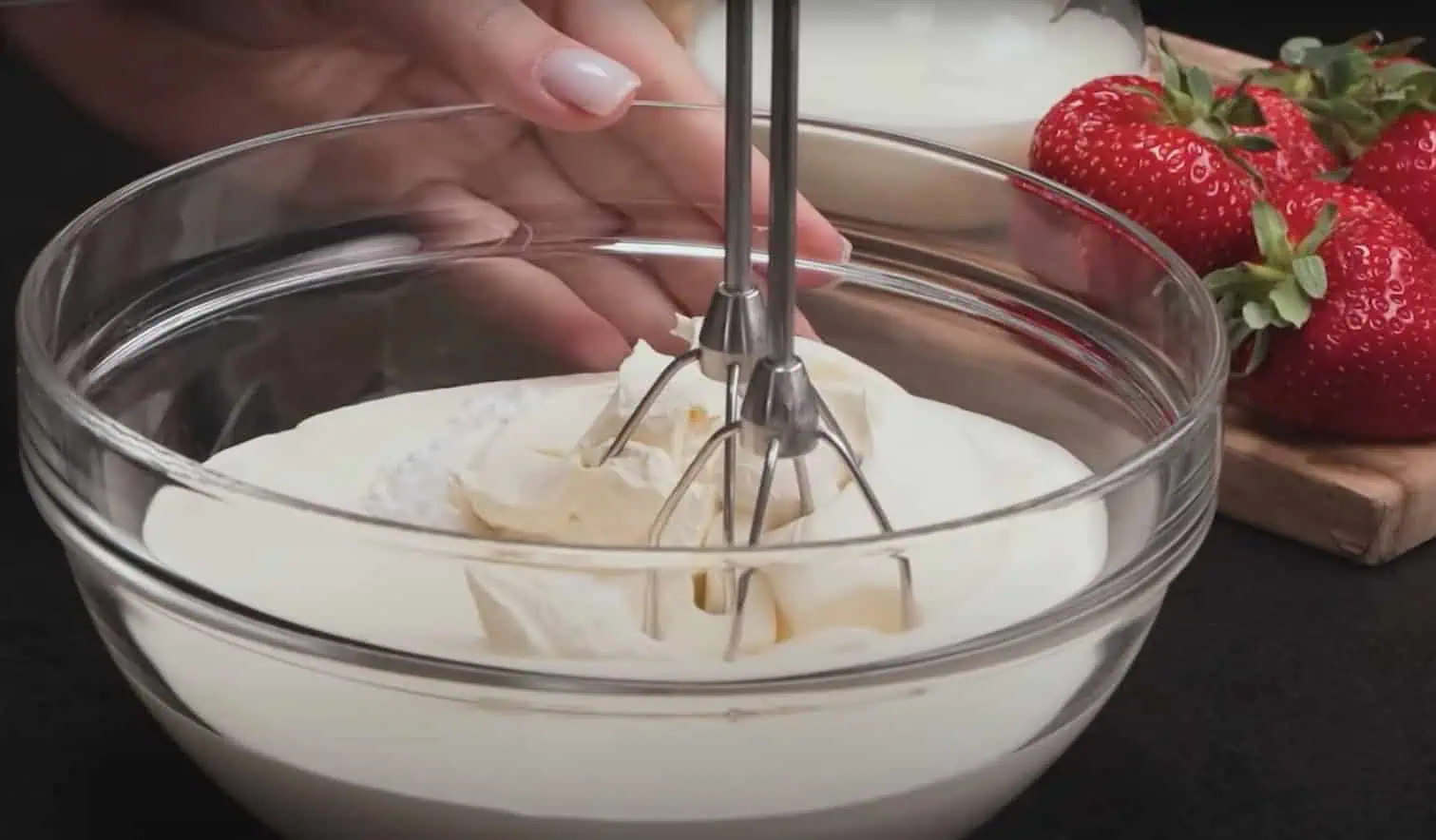 Potom si do misy nalejeme šľahačkovú smotanu, pridáme 50 g cukru a vyšľaháme hustú šľahačku.