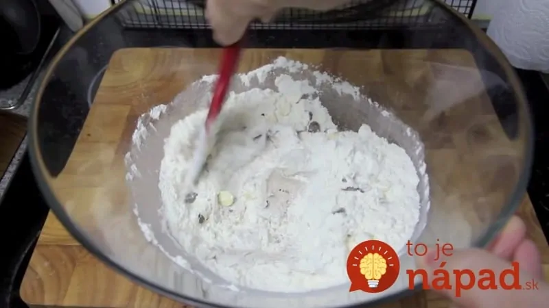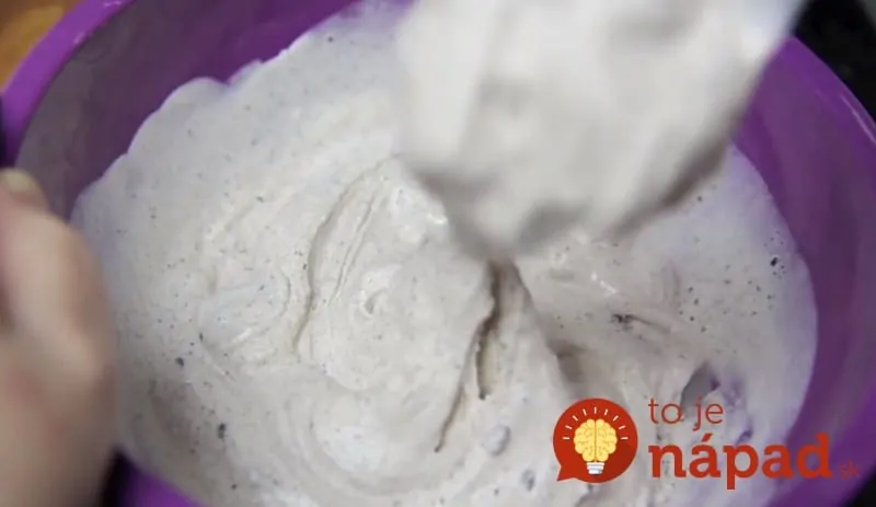 Potom ku zmrzline primiešame múku, prášok do pečiva a čokoládu.